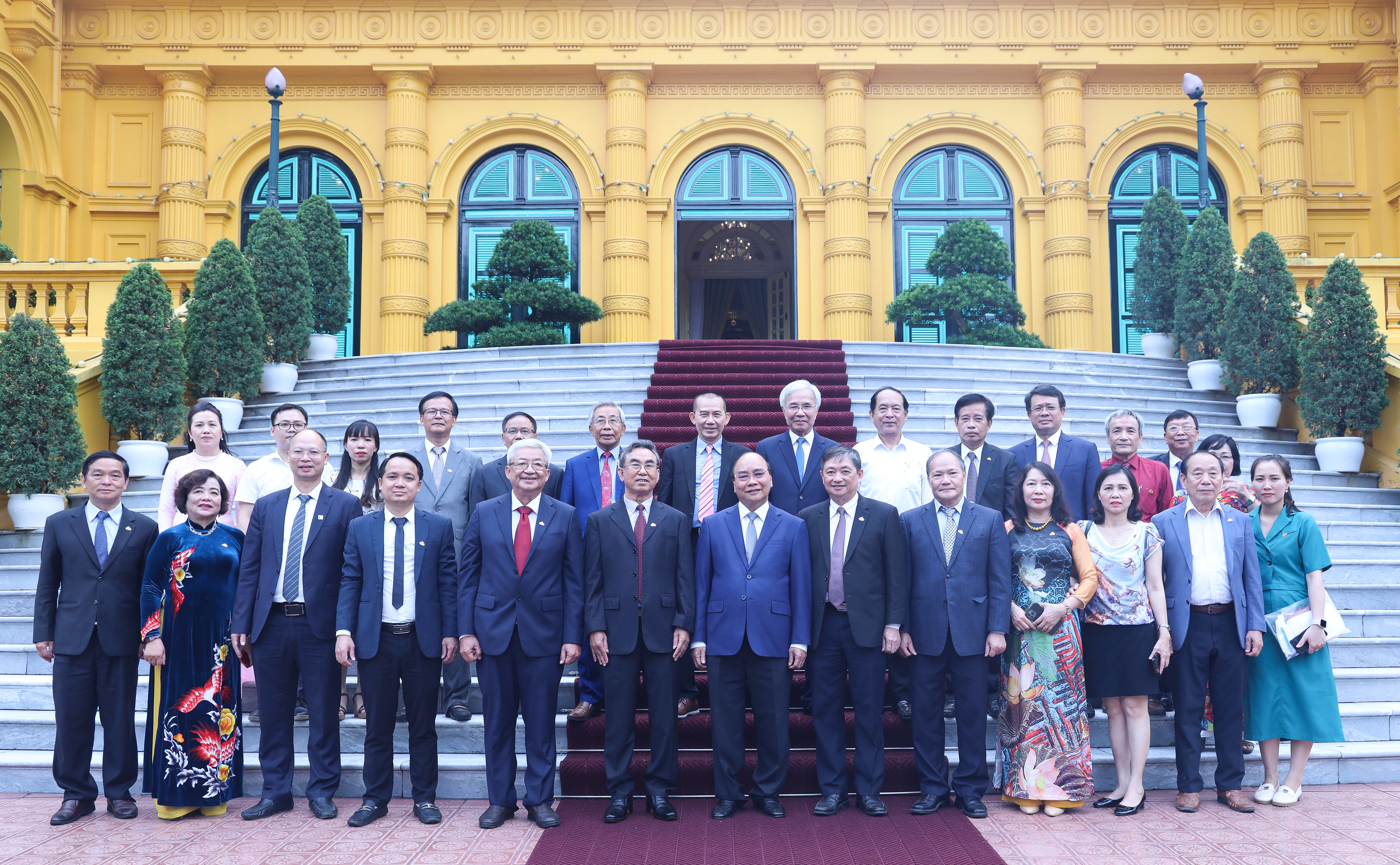 Chủ tịch nước Nguyễn Xuân Phúc chụp ảnh lưu niệm cùng Đoàn đại biểu Tổng hội xây dựng Việt Nam. Ảnh: VPCTN