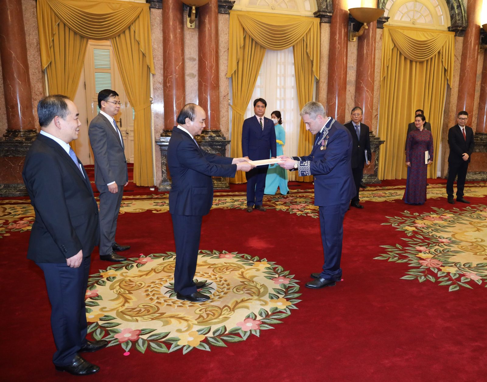 Chủ tịch nước Nguyễn Xuân Phúc nhận Quốc thư từ Đại sứ Belarus. Ảnh: VPCTN