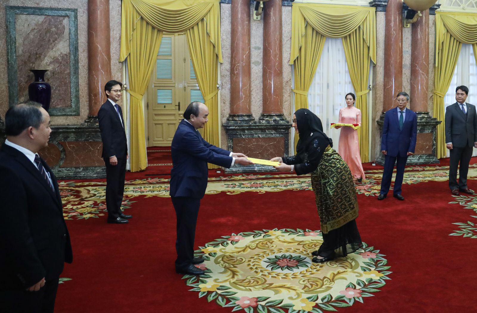 Chủ tịch nước Nguyễn Xuân Phúc tiếp nhận Quốc thư của Đại sứ Brunei Malai Halimah Malai Yussof. Ảnh: VPCTN