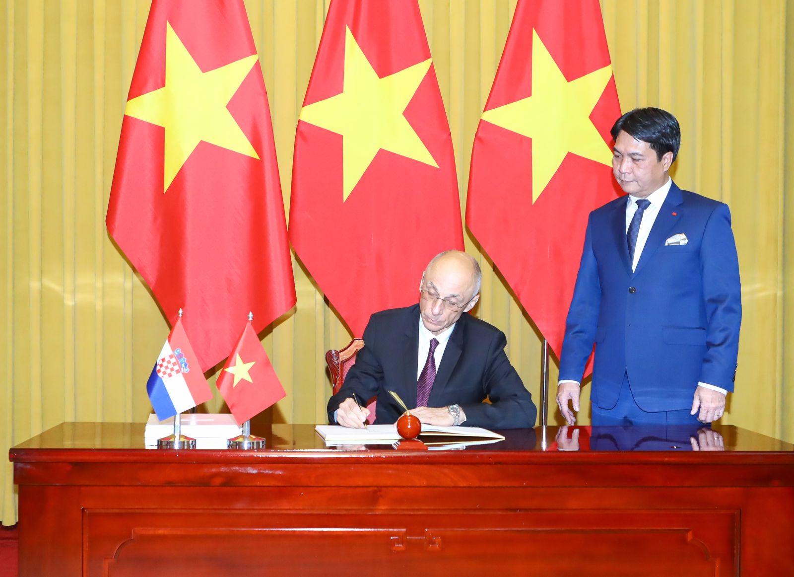 Đại sứ Đặc mệnh toàn quyền Cộng hoà Croatia tại Việt Nam Ivan Velimir Starcevic viết lưu bút vào Sổ vàng tại Phủ Chủ tịch. Ảnh: VPCTN