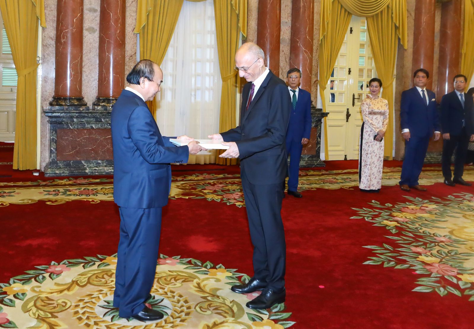 Chủ tịch nước Nguyễn Xuân Phúc nhận Quốc thư từ Đại sứ Đặc mệnh toàn quyền Cộng hoà Croatia tại Việt Nam Ivan Velimir Starcevic. Ảnh: VPCTN