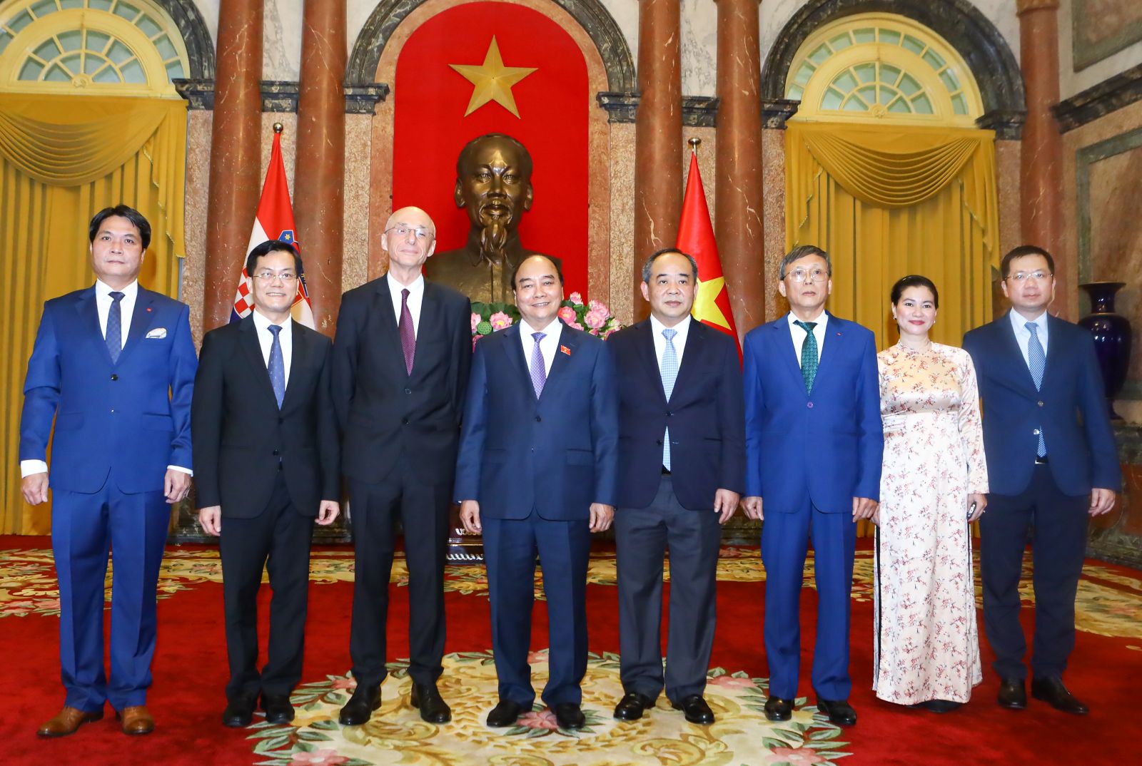 Chủ tịch nước Nguyễn Xuân Phúc chụp ảnh lưu niệm cùng Đại sứ Đặc mệnh toàn quyền Cộng hoà Croatia tại Việt Nam Ivan Velimir Starcevic và các đại biểu. Ảnh: VPCTN