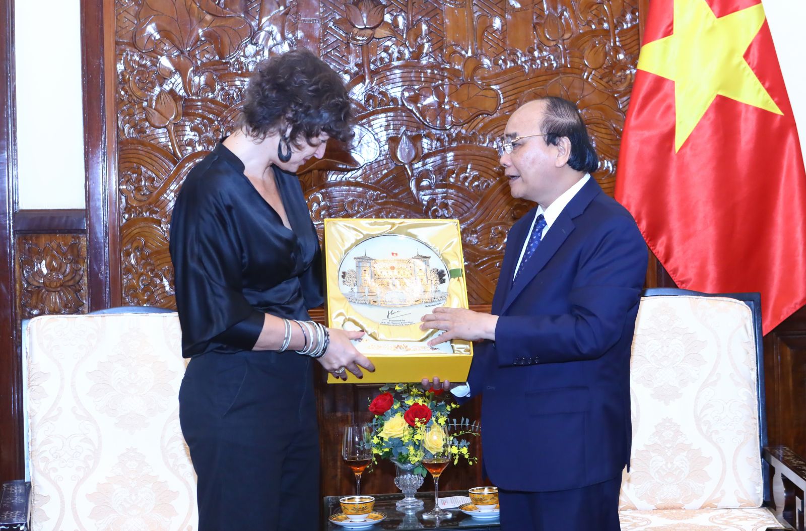 Chủ tịch nước Nguyễn Xuân Phúc tặng quà lưu niệm cho Đại sứ Hà Lan Elsbeth Akkerman. Ảnh: VPCTN