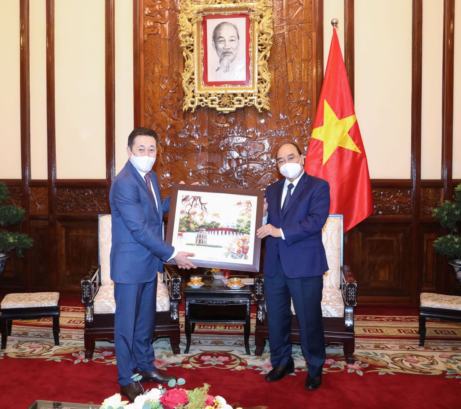 Chủ tịch nước tặng quà lưu niệm Đại sứ Kairat Sarybay. Ảnh: VPCTN