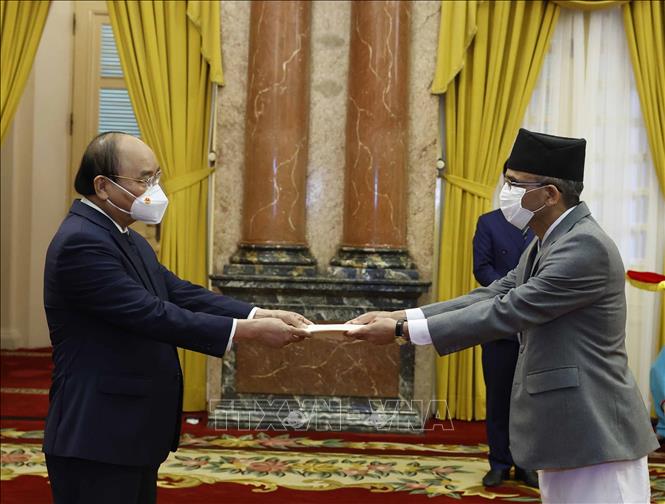 Chủ tịch nước Nguyễn Xuân Phúc nhận Quốc thư của Đại sứ Nepal Ganesh Prasad Dhakal.