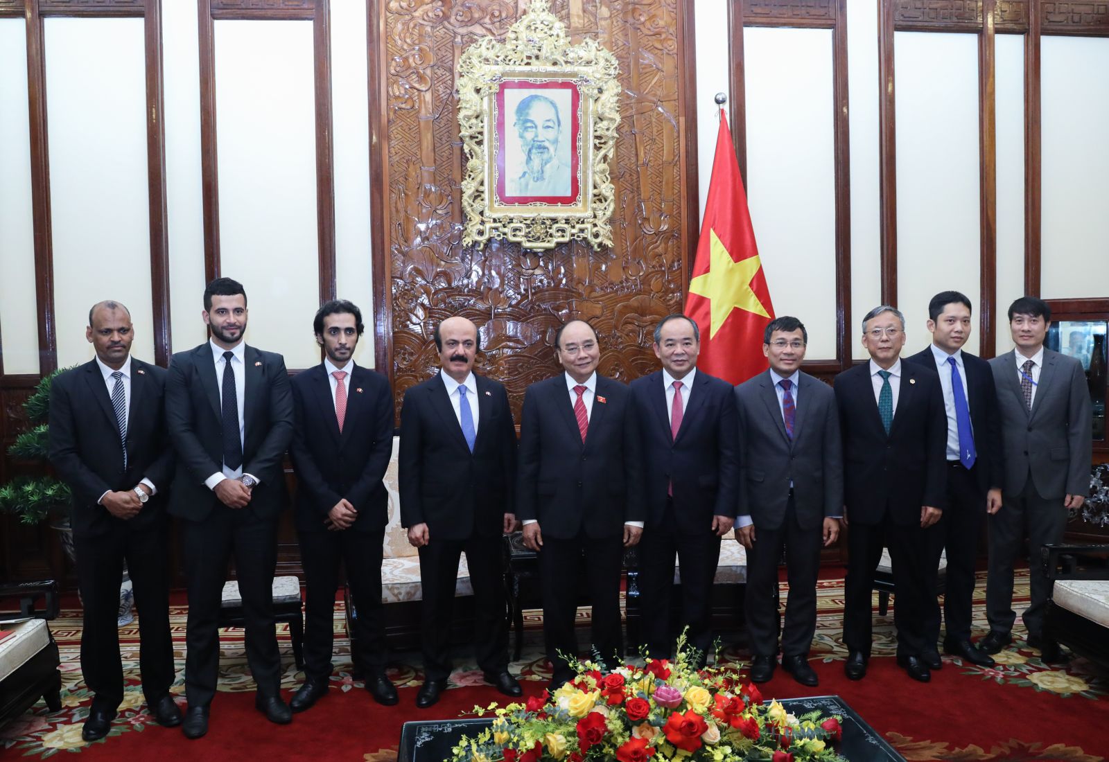 Chủ tịch nước Nguyễn Xuân Phúc chụp ảnh chung cùng Đại sứ Qatar Mohamed Ismail Al-Emadi. Ảnh: VPCTN
