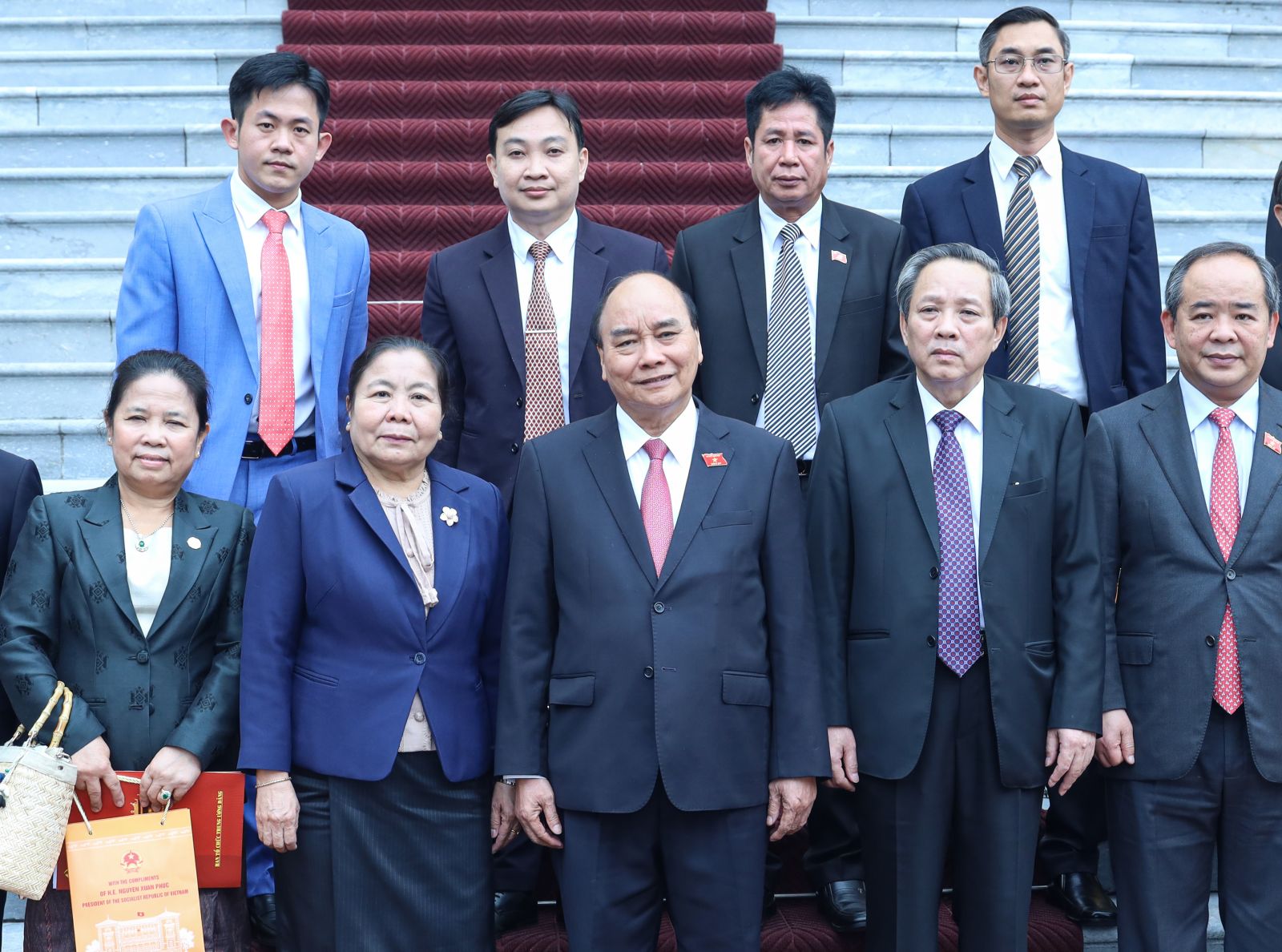 Chủ tịch nước Nguyễn Xuân Phúc và đồng chí Sisay Leudetmounsone chụp ảnh chung với các đại biểu. Ảnh: VPCTN