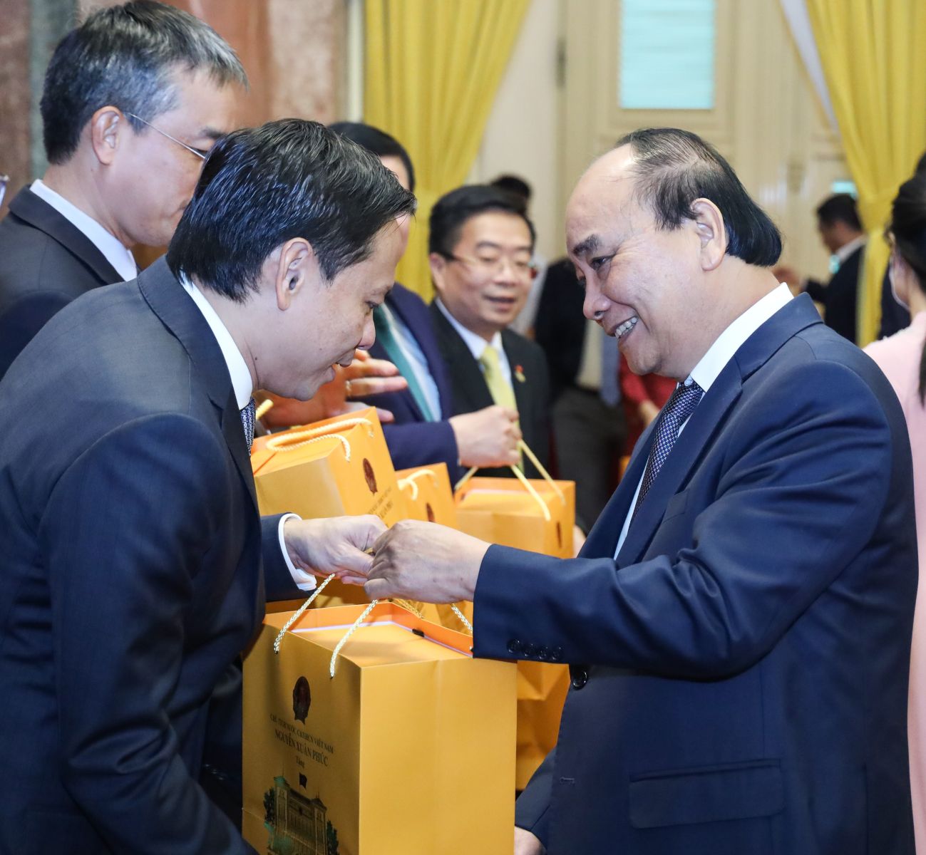 Chủ tịch nước Nguyễn Xuân Phúc tặng quà lưu niệm cho các đại biểu tham dự. Ảnh: VPCTN
