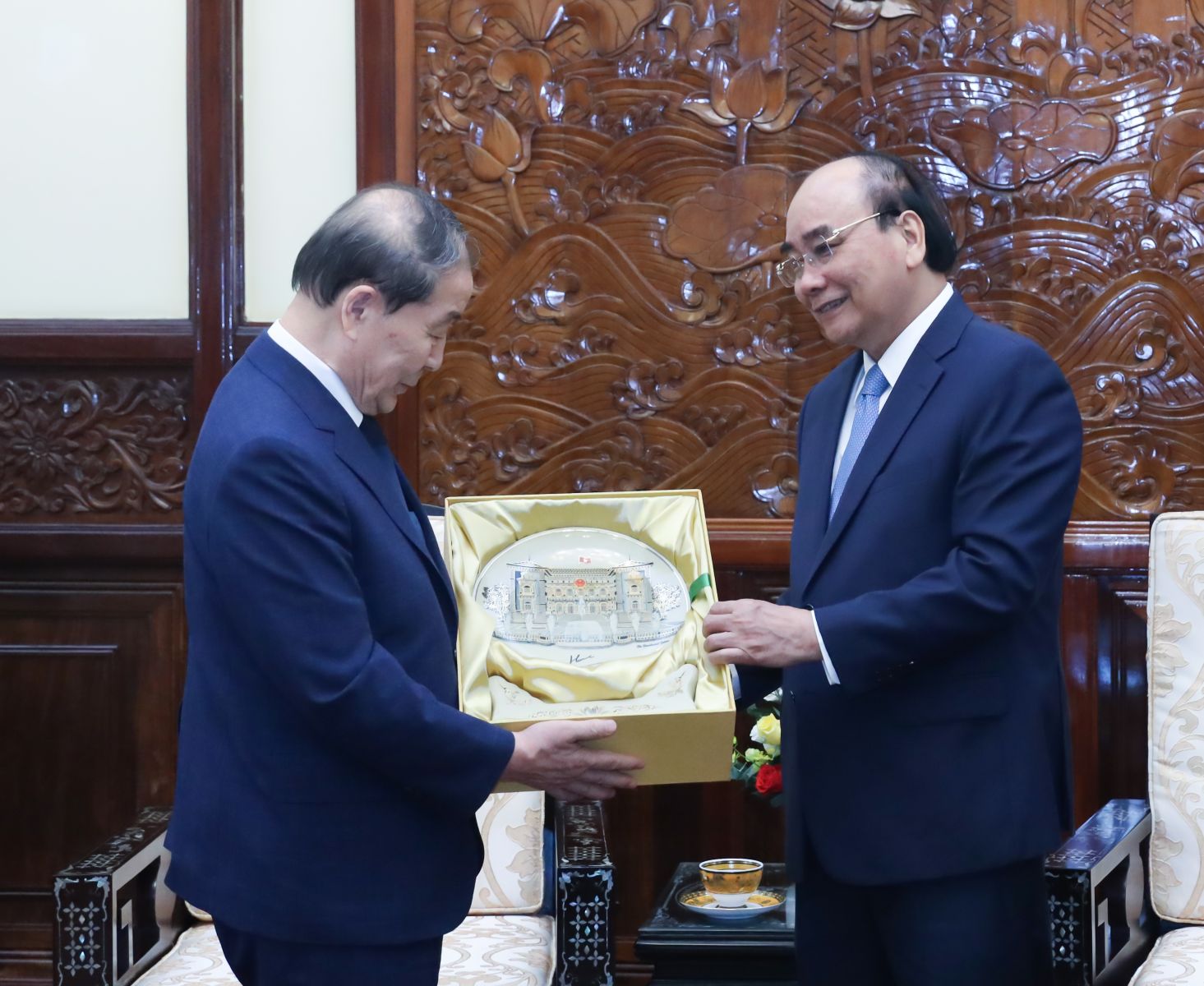 Chủ tịch nước Nguyễn Xuân Phúc tặng quà lưu niệm nguyên Chủ tịch Hội Hữu nghị Hàn - Việt Choi Young Joo. Ảnh: VPCTN