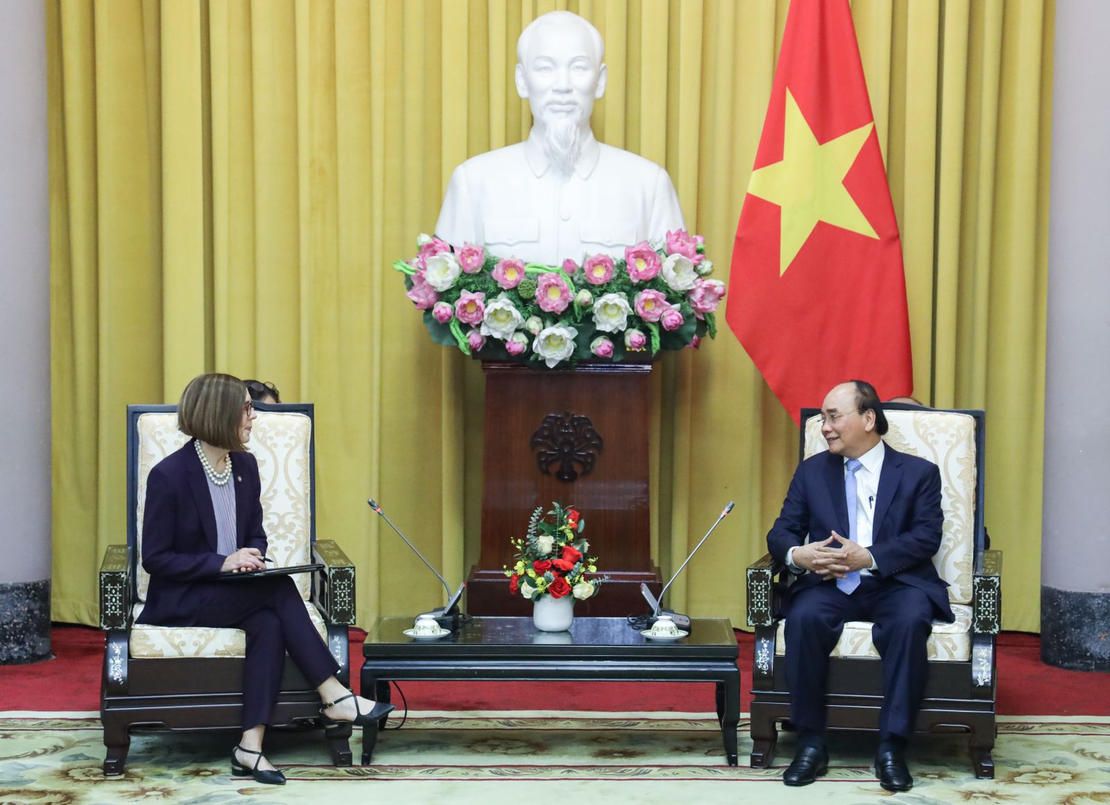 Chủ tịch nước Nguyễn Xuân Phúc tiếp Thống đốc Bang Oregon (Hoa Kỳ) Kate Brown. Ảnh: VPCTN