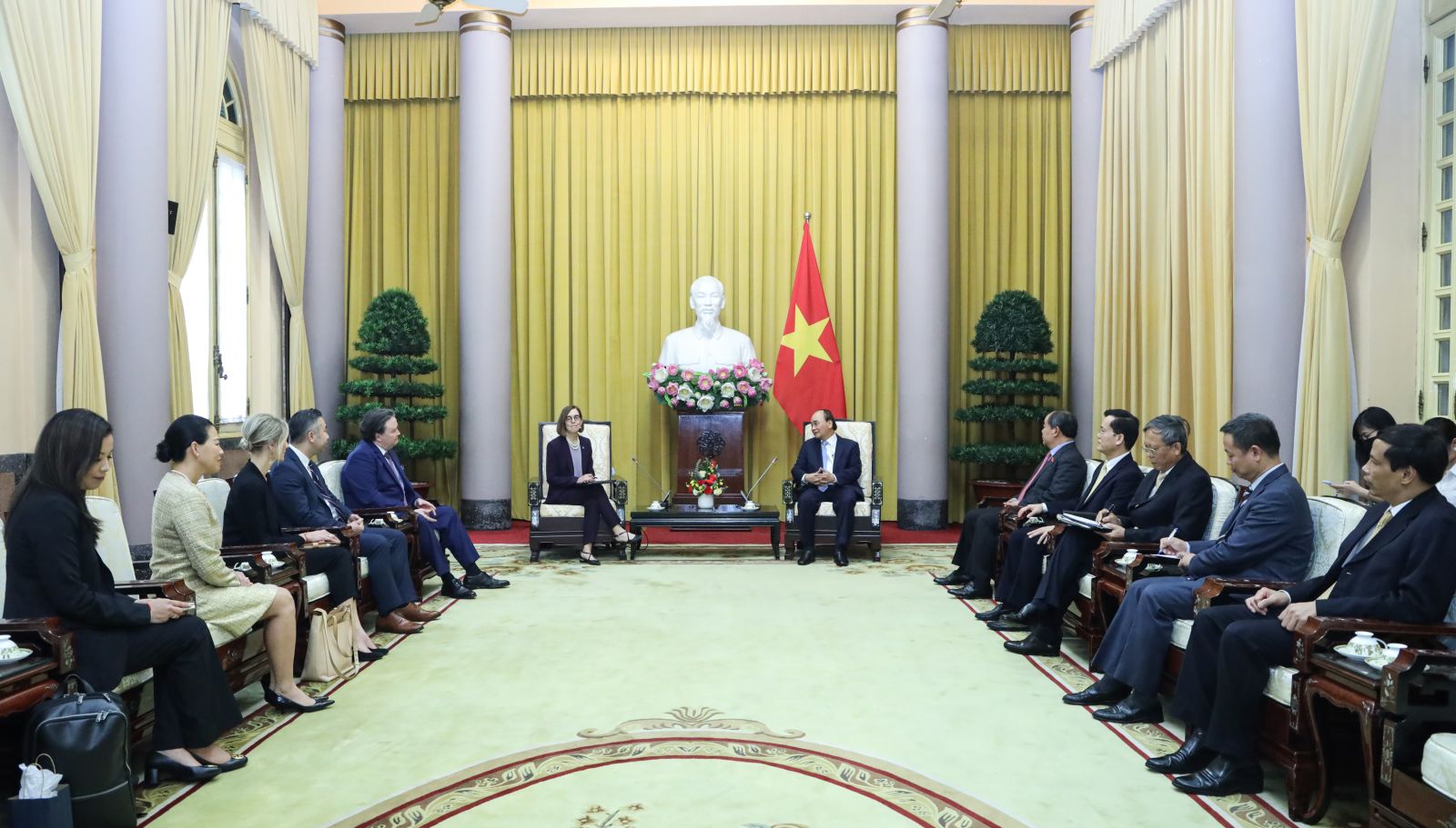Chào mừng bà Kate Brown trong chuyến thăm Việt Nam lần thứ 2, Chủ tịch nước Nguyễn Xuân Phúc bày tỏ trân trọng và cảm ơn tình cảm, đánh giá tốt đẹp của Thống đốc bang Oregon dành cho Việt Nam.
