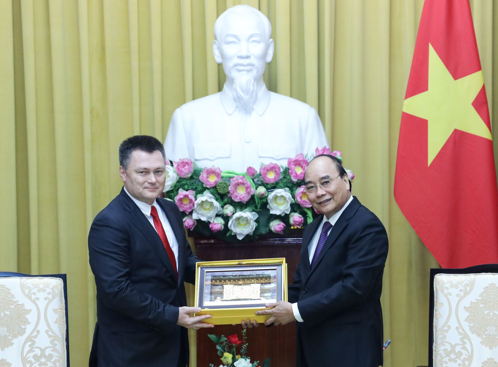 Chủ tịch nước Nguyễn Xuân Phúc tặng quà lưu niệm cho Viện trưởng Tổng Viện Kiểm sát Liên bang Nga Igor Krasnov. Ảnh: VPCTN