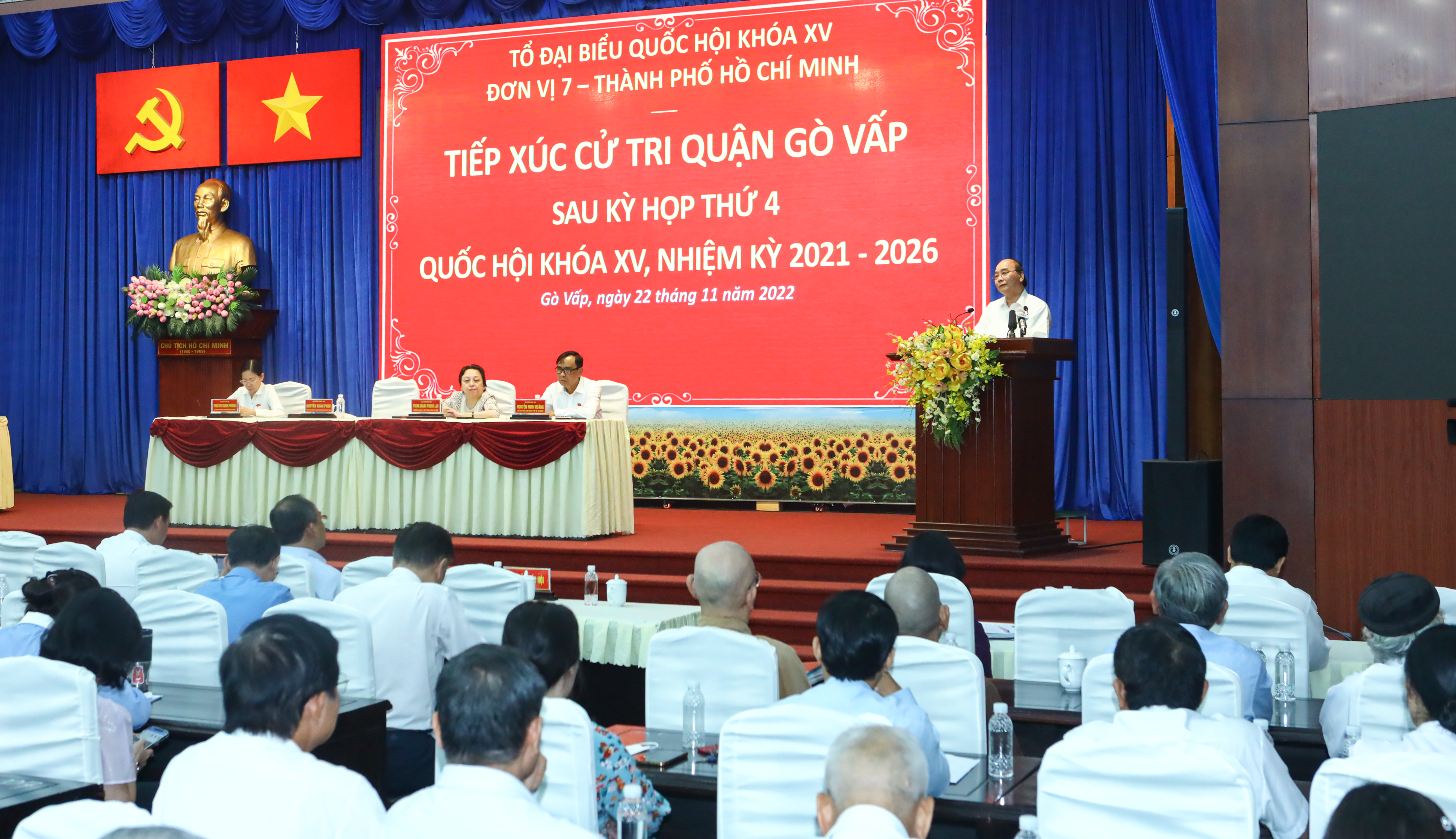 Chủ tịch nước Nguyễn Xuân Phúc cùng Tổ Đại biểu Quốc hội Thành phố Hồ Chí Minh đơn vị số 7 lắng nghe những ý kiến của cử tri Quận Gò Vấp. Ảnh: VPCTN