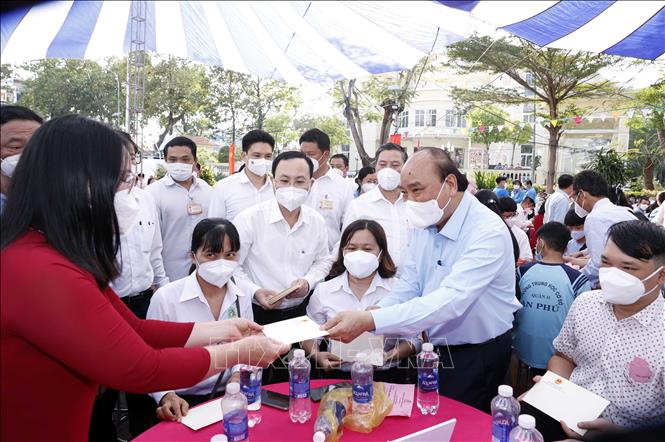 Chủ tịch nước Nguyễn Xuân Phúc tặng quà Tết cho đội ngũ y bác sỹ, cán bộ công chức có hoàn cảnh khó khăn, cũng là những người có nhiều thành tích trong hoạt động đoàn thể và phòng chống dịch trên địa bàn Thành phố Thủ Đức.