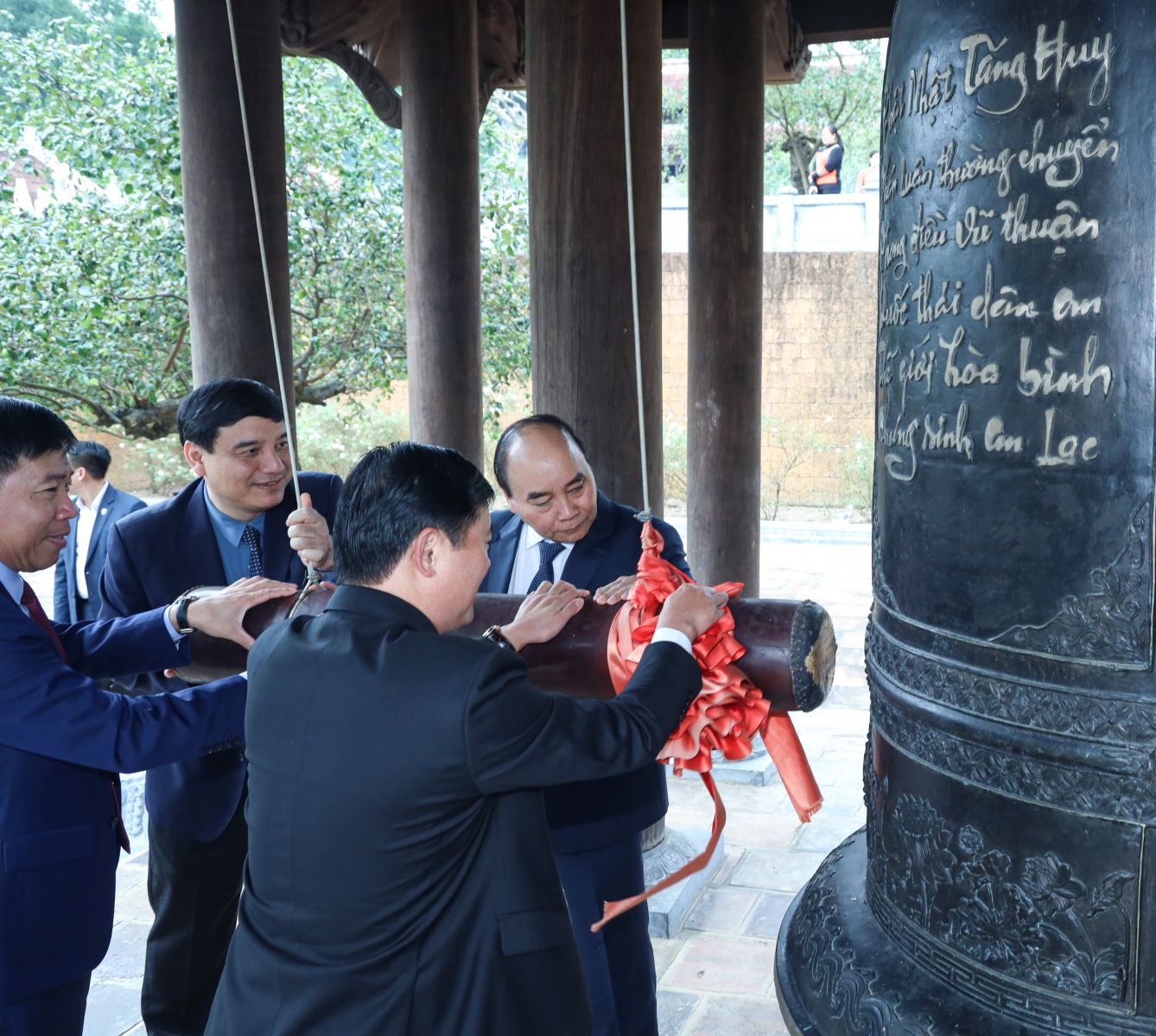 Chủ tịch nước Nguyễn Xuân Phúc và đoàn công tác thỉnh chuông tại Đền Chung Sơn. Ảnh: VPCTN