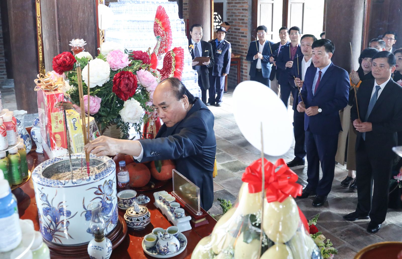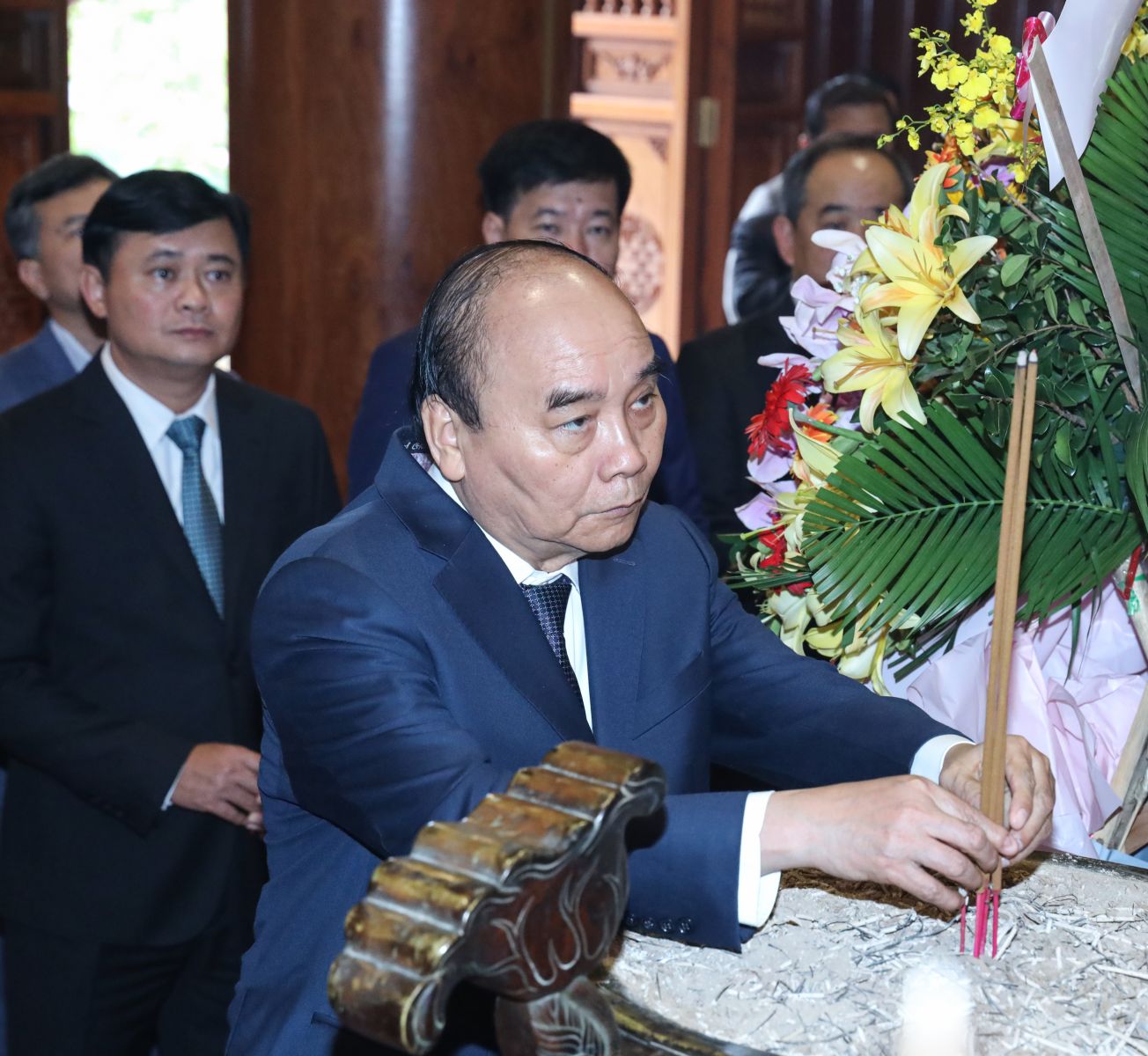 Chủ tịch nước Nguyễn Xuân Phúc dâng hương tại Đền Chung Sơn - Đền thờ gia tiên Bác Hồ. Ảnh: VPCTN