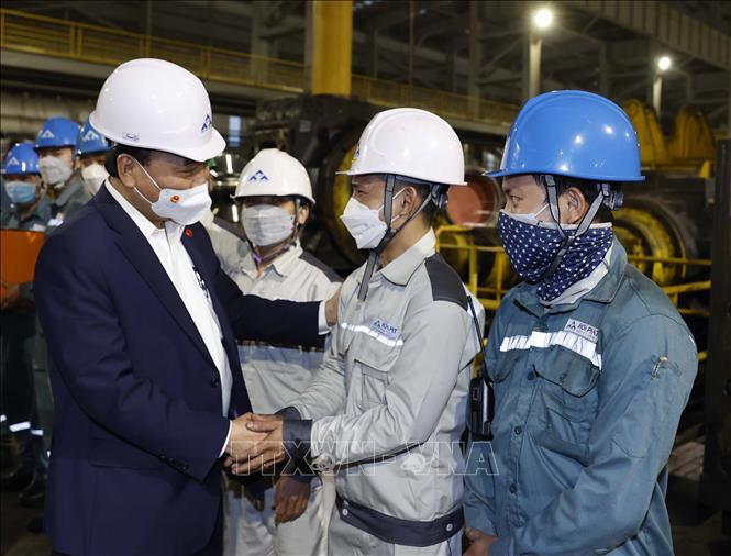 Chủ tịch nước Nguyễn Xuân Phúc động viên cán bộ, công nhân Công ty cổ phần Thép Hòa Phát Dung Quất. Ảnh: Thống Nhất/TTXVN