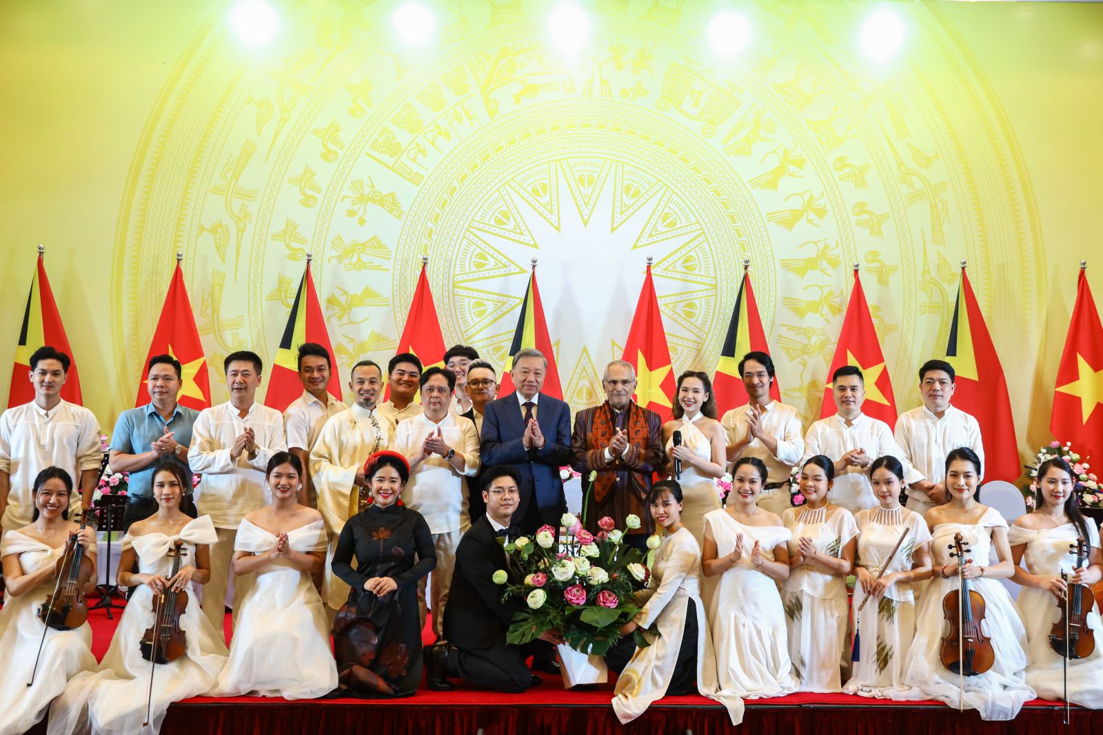Chủ tịch nước Tô Lâm và Tổng thống Timor-Leste Jose Ramos-Horta tặng hoa cho các nghệ sỹ. Ảnh: VPCTN