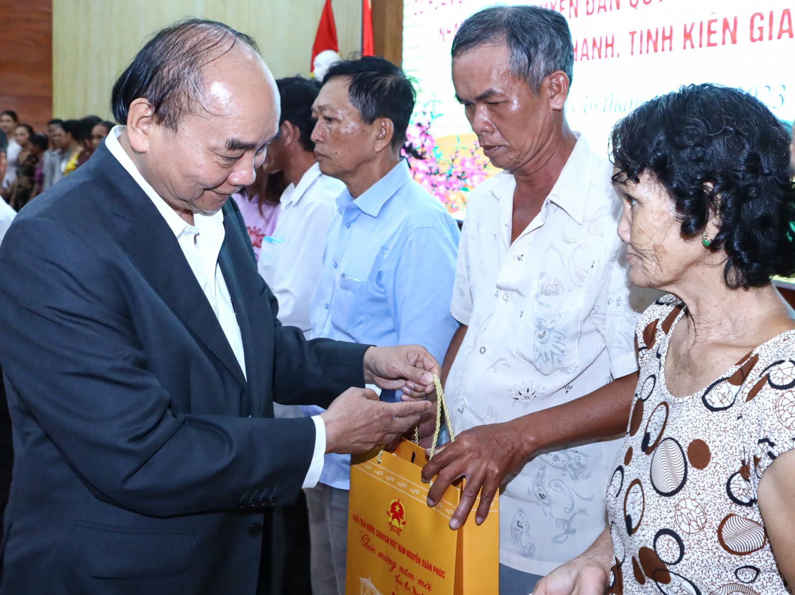 Chủ tịch nước Nguyễn Xuân Phúc tặng quà Tết cho các gia đình chính sách huyện Hòn Đất, tỉnh Kiên Giang. Ảnh: VPCTN
