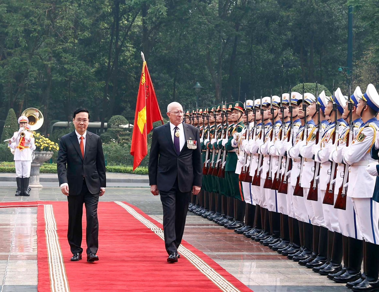 Chủ tịch nước Võ Văn Thưởng và Toàn quyền Australia David Hurley duyệt đội danh dự Quân đội nhân dân Việt Nam. Ảnh: VPCTN