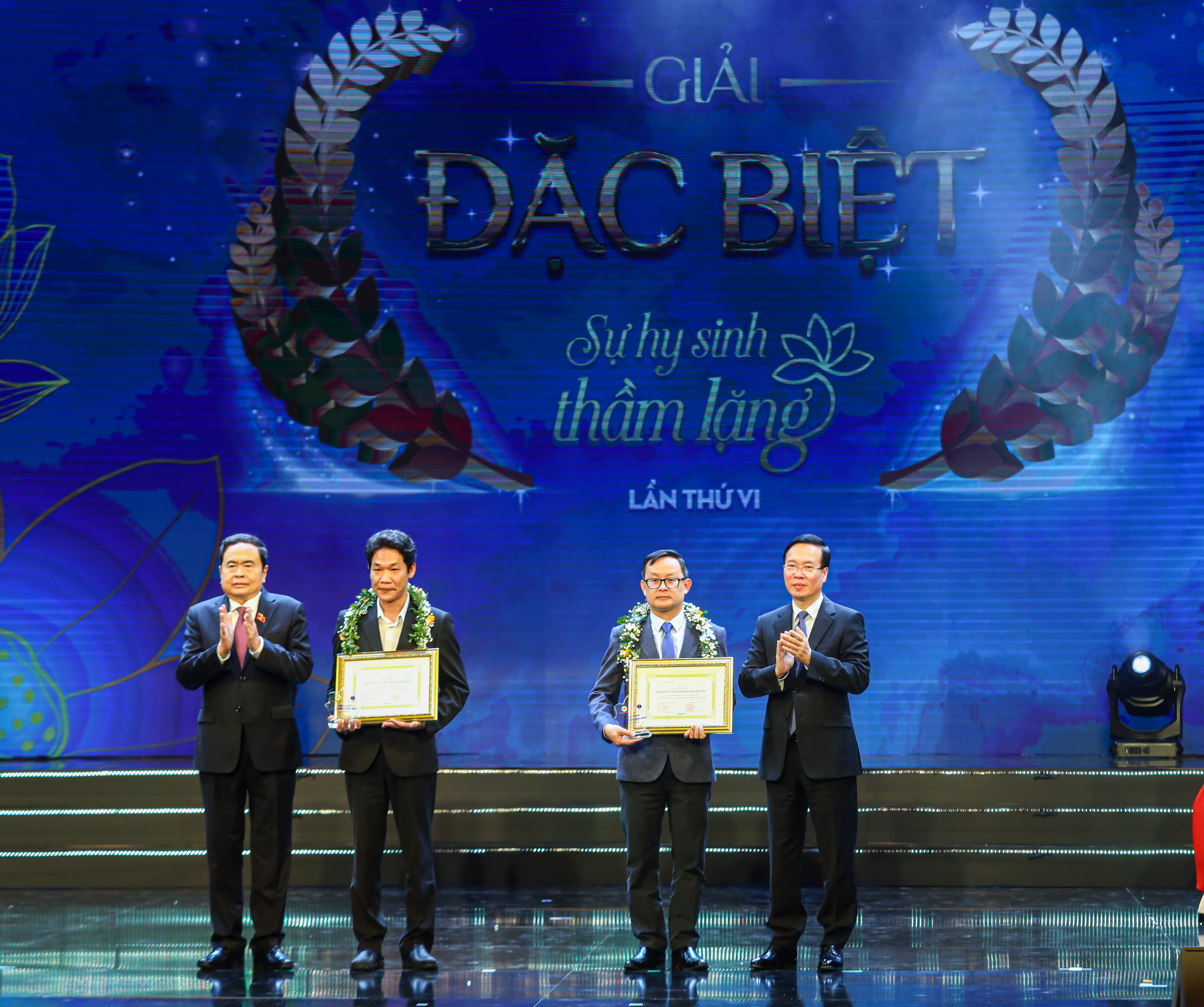Chủ tịch nước Võ Văn Thưởng và Phó Chủ tịch Thường trực Quốc hội Trần Thanh Mẫn trao Giải Đặc biệt cho tác giả Ngô Anh Văn (Báo Sức khoẻ & Đời sống) và trao chứng nhận cho nhân vật trong tác phẩm đoạt giải là Bác sĩ Võ Thái Trung, Phó trưởng Khoa Chấn thương – Chỉnh hình (Bệnh viện Đa khoa tỉnh Bình Dương). Ảnh: VPCTN