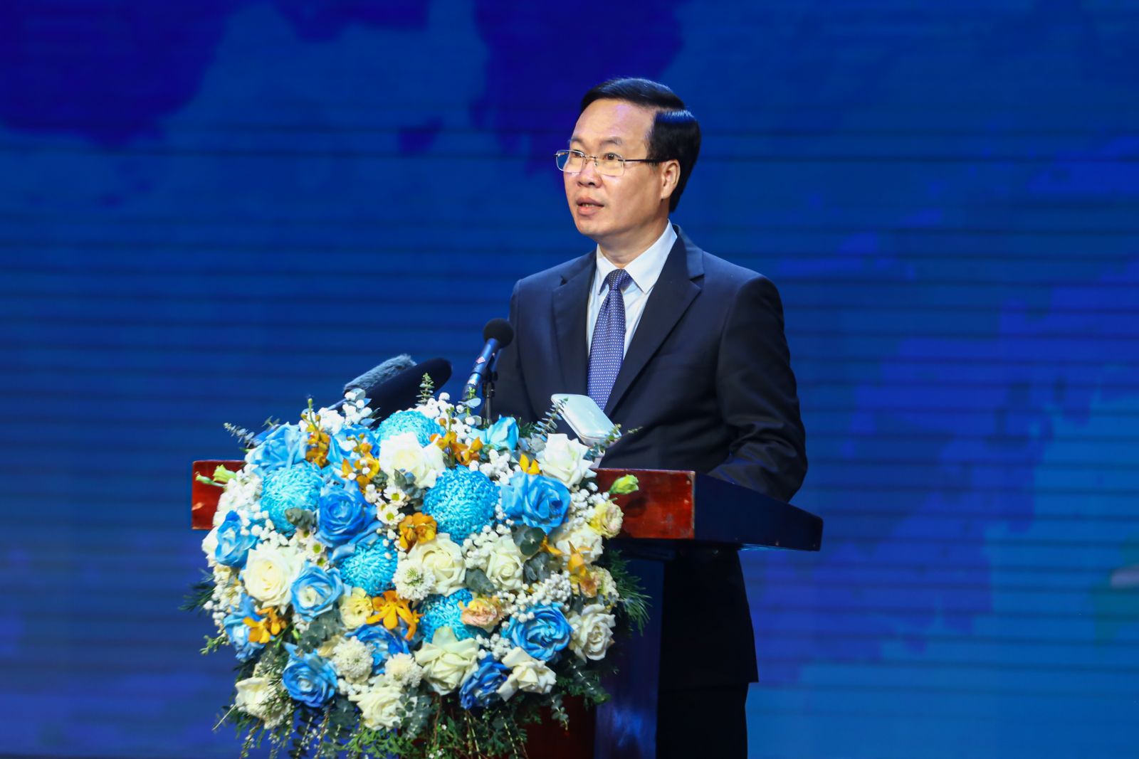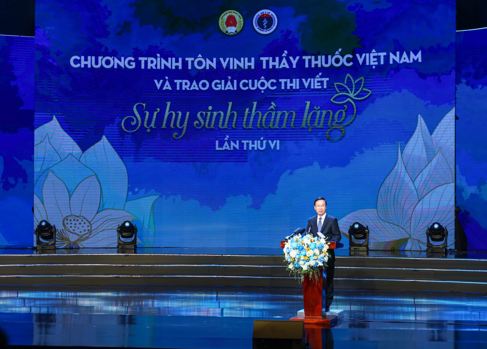 Chủ tịch nước Võ Văn Thưởng phát biểu tại Chương trình Tôn vinh Thầy thuốc Việt Nam và trao giải cuộc thi viết “Sự hy sinh thầm lặng” lần thứ 6. Ảnh:VPCTN