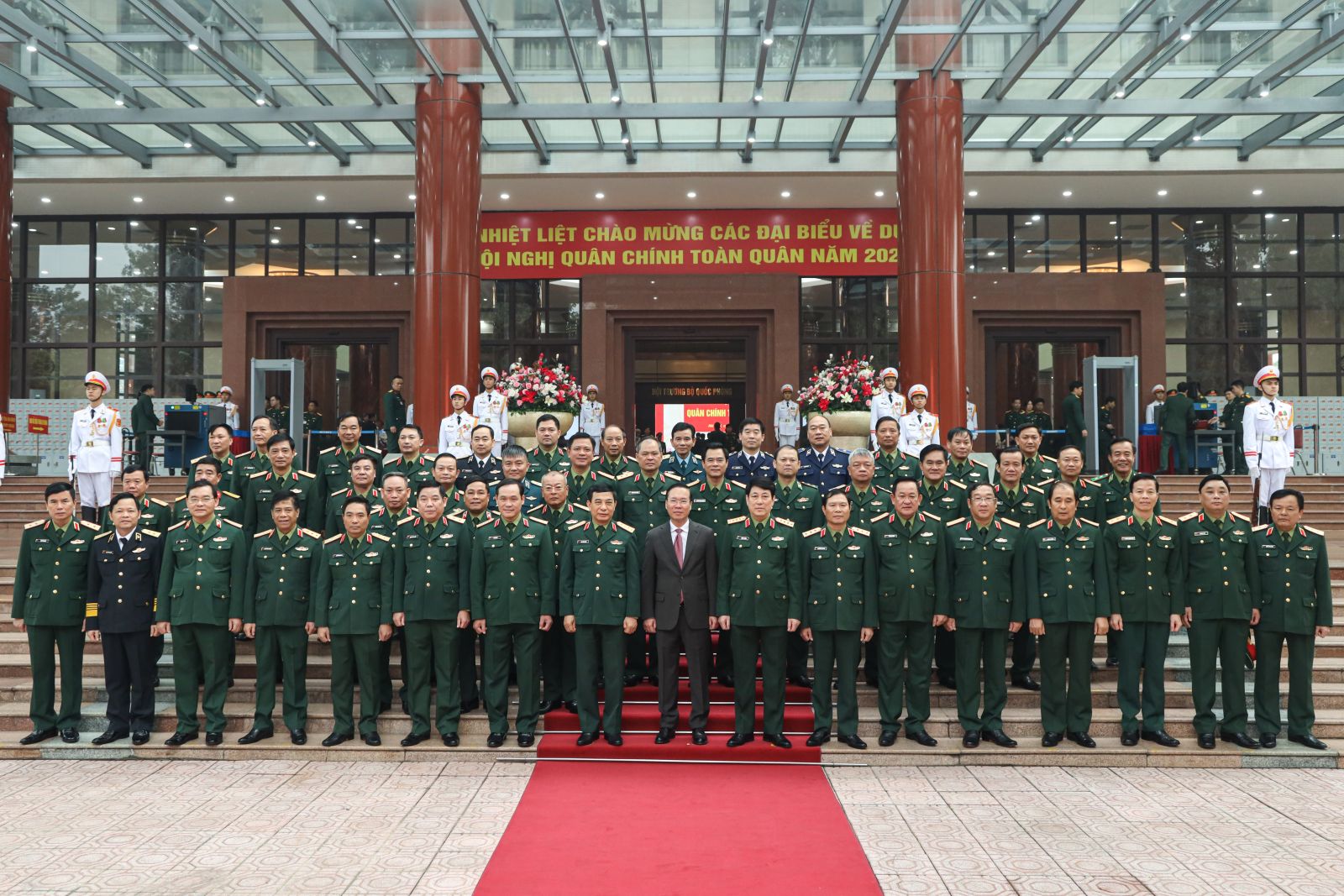 Chủ tịch nước Võ Văn Thưởng với lãnh đạo Quân ủy Trung ương, Bộ Quốc phòng và các đại biểu. Ảnh: VPCTN