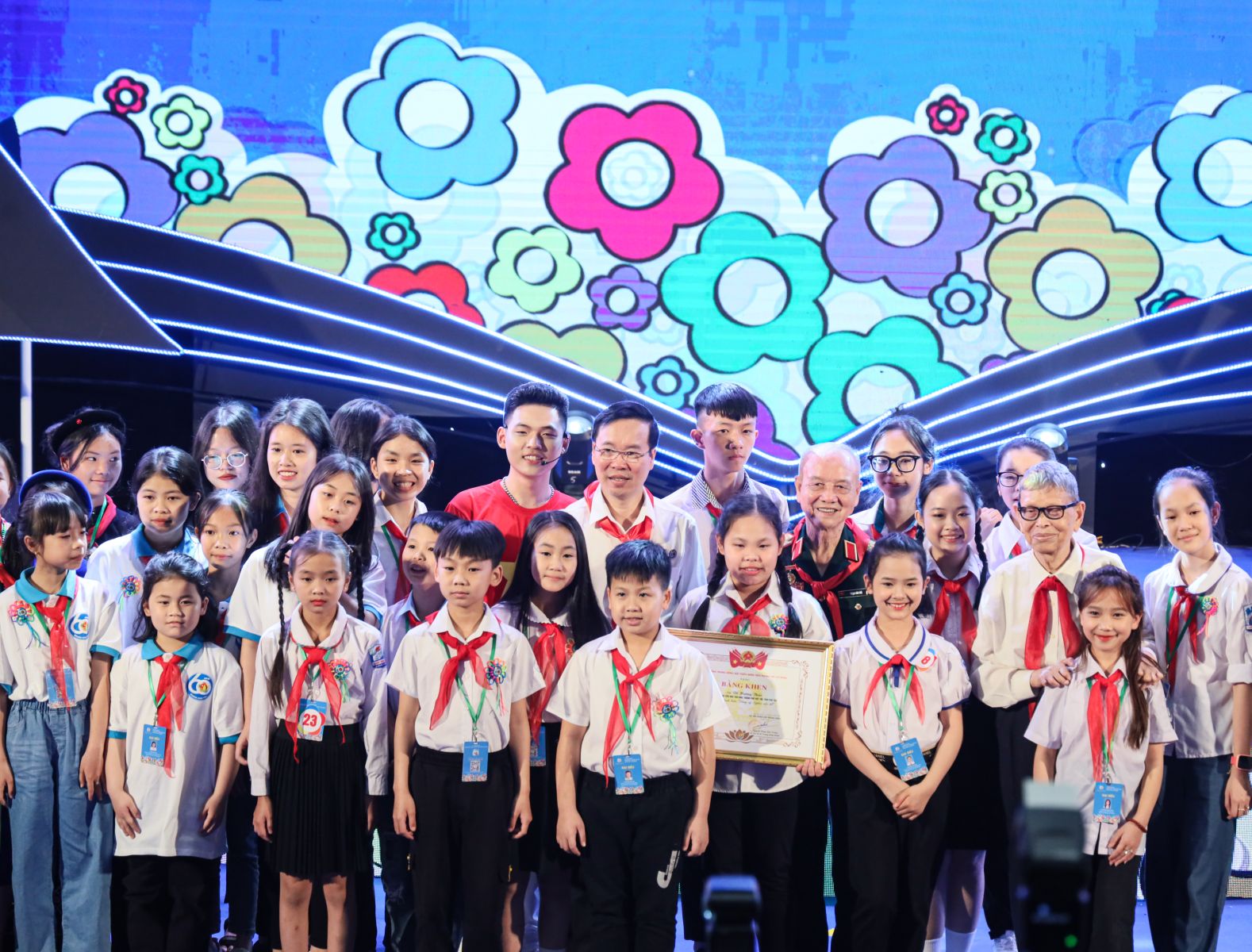 Chủ tịch nước Võ Văn Thưởng và các ”Dũng sĩ nghìn việc tốt” tại buổi lễ. Ảnh: VPCTN