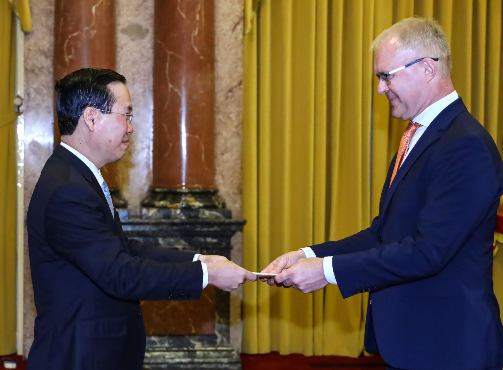 Chủ tịch nước Võ Văn Thưởng nhận Quốc thư từ Đại sứ Estonia Hannes Hanso. Ảnh: VPCTN