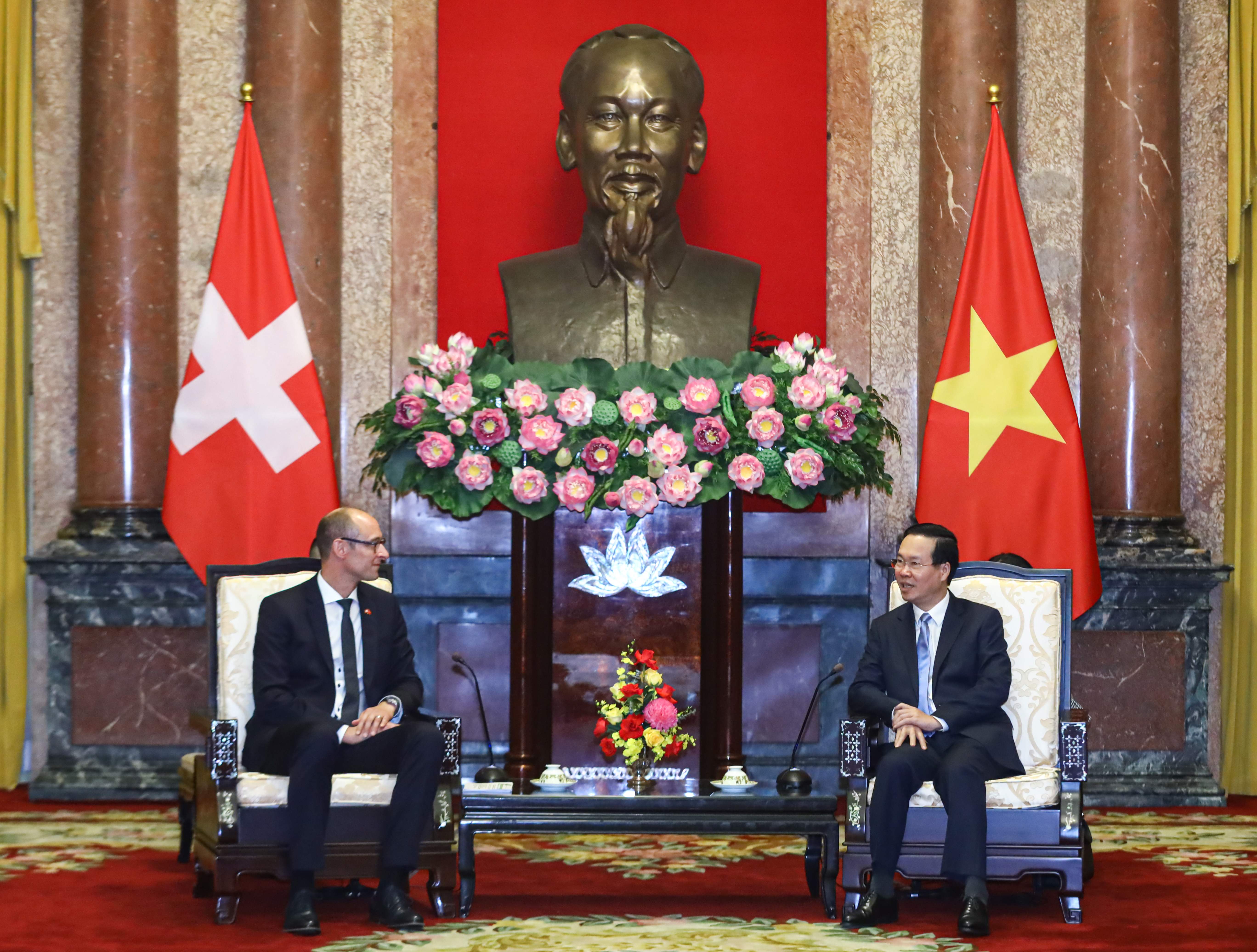 Thay mặt Nhà nước và nhân dân Việt Nam, Chủ tịch nước Võ Văn Thưởng nhiệt liệt chào mừng Chủ tịch Hội đồng Quốc gia Thụy Sĩ Martin Candinas và Đoàn sang thăm Việt Nam; tin tưởng chuyến thăm sẽ góp phần quan trọng vào việc thúc đẩy quan hệ hợp tác hai nước Việt Nam - Thụy Sĩ ngày càng phát triển tốt đẹp.