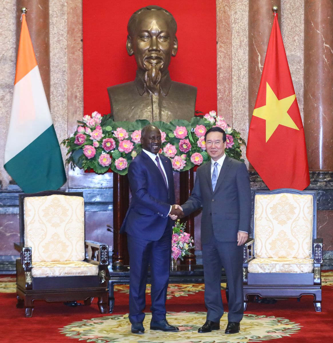 Chủ tịch nước Võ Văn Thưởng tin tưởng Bờ Biển Ngà sẽ tiếp tục giữ vững ổn định chính trị, phát triển kinh tế-xã hội, triển khai hiệu quả “Tầm nhìn 2030”, từng bước xây dựng đất nước ngày càng phồn vinh, nâng cao vai trò, vị thế tại các diễn đàn khu vực và quốc tế.