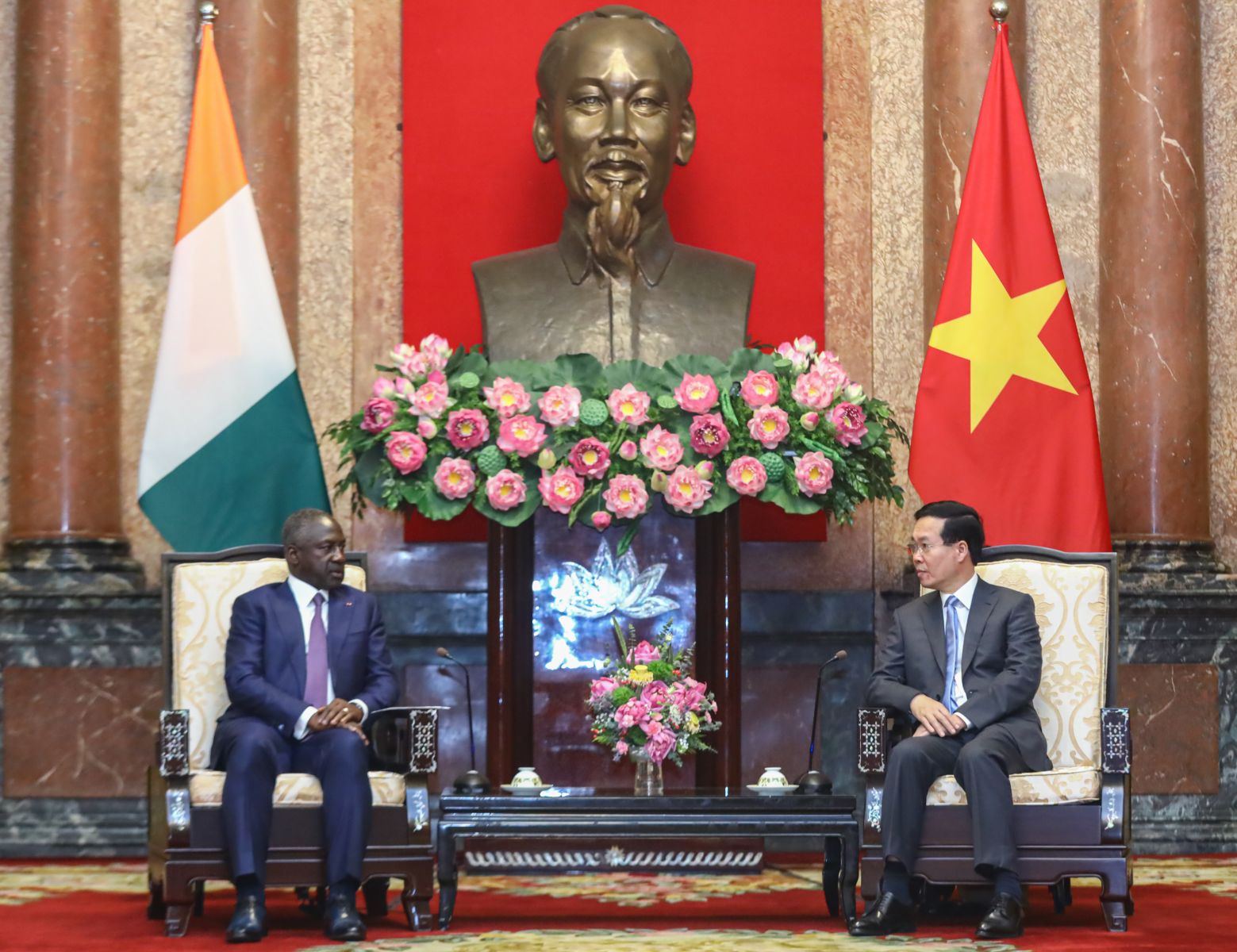 Chủ tịch nước Võ Văn Thưởng và Chủ tịch Quốc hội Bờ Biển Ngà Adama Bictogo nhất trí cần đẩy mạnh hơn nữa hợp tác thương mại theo hướng bền vững và cân bằng, tạo điều kiện mở rộng xuất khẩu sang thị trường của nhau cũng như thị trường khu vực ASEAN và châu Phi. Hai Nhà lãnh đạo khẳng định cần ưu tiên thúc đẩy, mở rộng hợp tác trong các lĩnh vực nông nghiệp, đầu tư./.