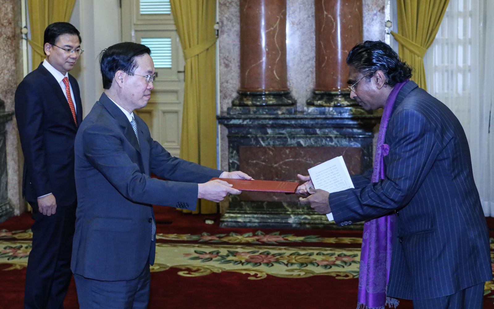 Chủ tịch nước Võ Văn Thưởng tiếp nhận Quốc thư của Đại sứ Sri Lanka Sajeewa Umanga Mendis. Ảnh: VPCTN