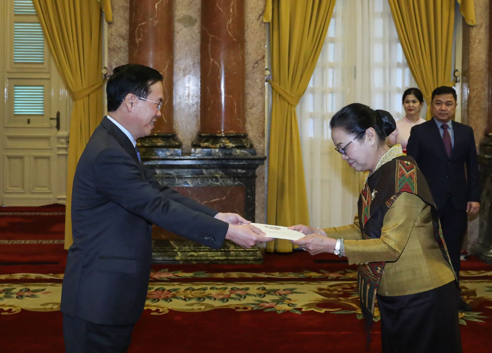 Chủ tịch nước Võ Văn Thưởng tiếp nhận Quốc thư của Đại sứ Lào Khamphao Ernthavanh. Ảnh: VPCTN