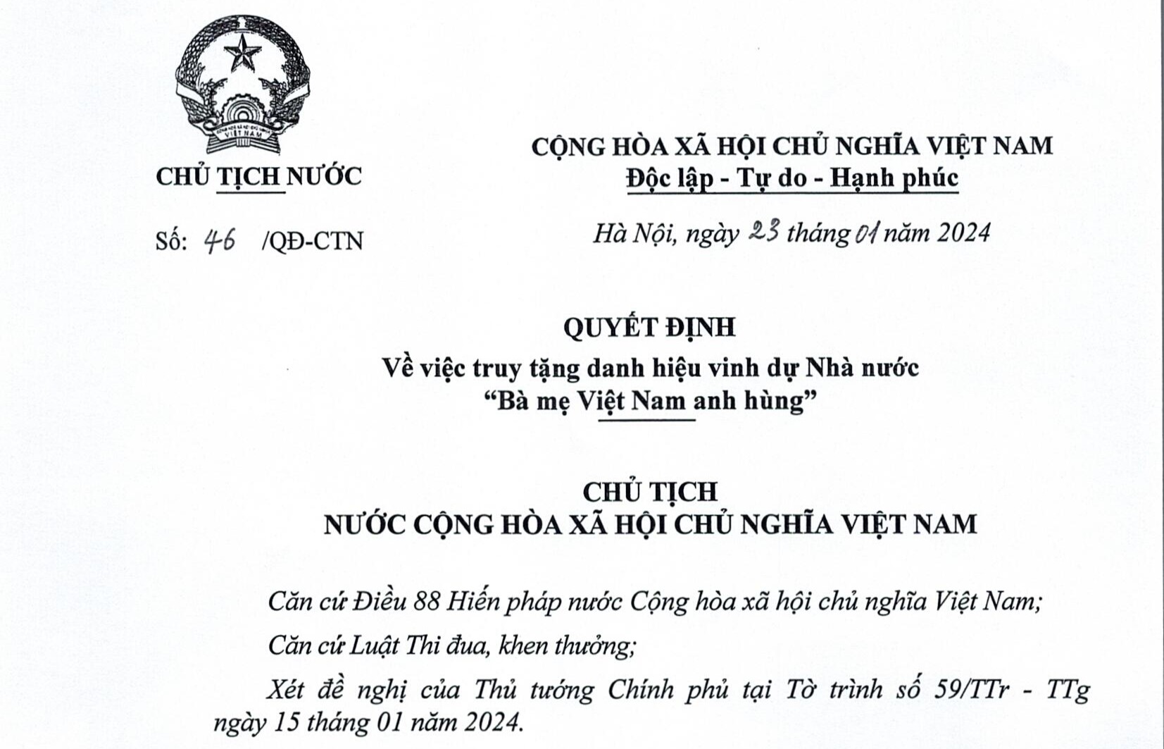 Chủ tịch nước Võ Văn Thưởng truy tặng danh hiệu “Bà mẹ Việt Nam anh hùng” cho hai cá nhân