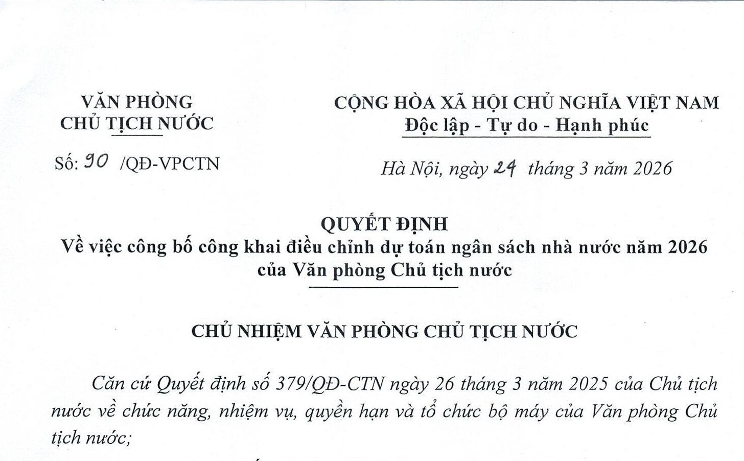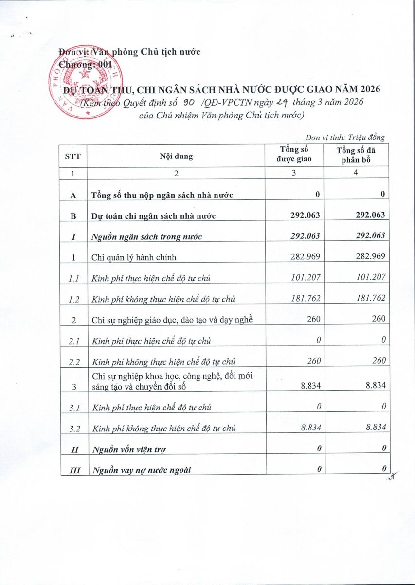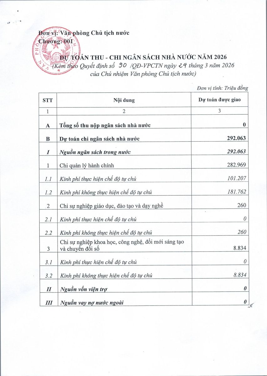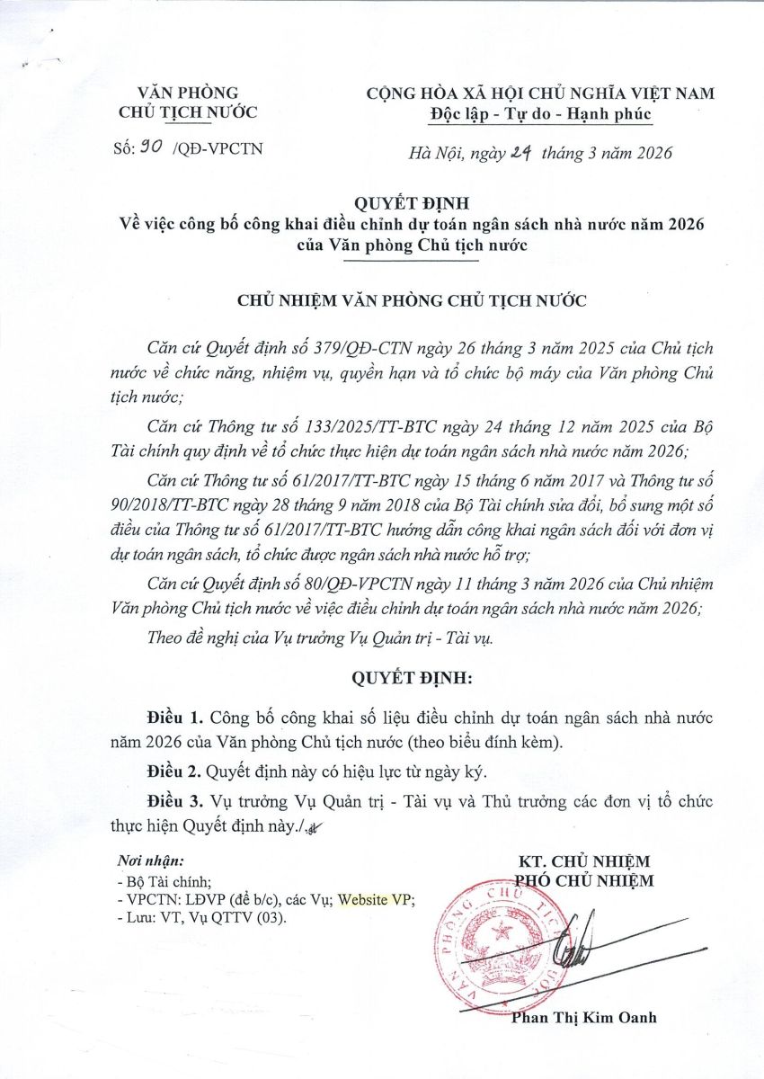 Ngày 24/3/2026, Văn phòng Chủ tịch nước đã ban hành Quyết định số 90/QĐ-VPCTN Về việc công bố công khai điều chỉnh dự toán ngân sách nhà nước năm 2026. Sau đây là nội dung chi tiết của Quyết định: