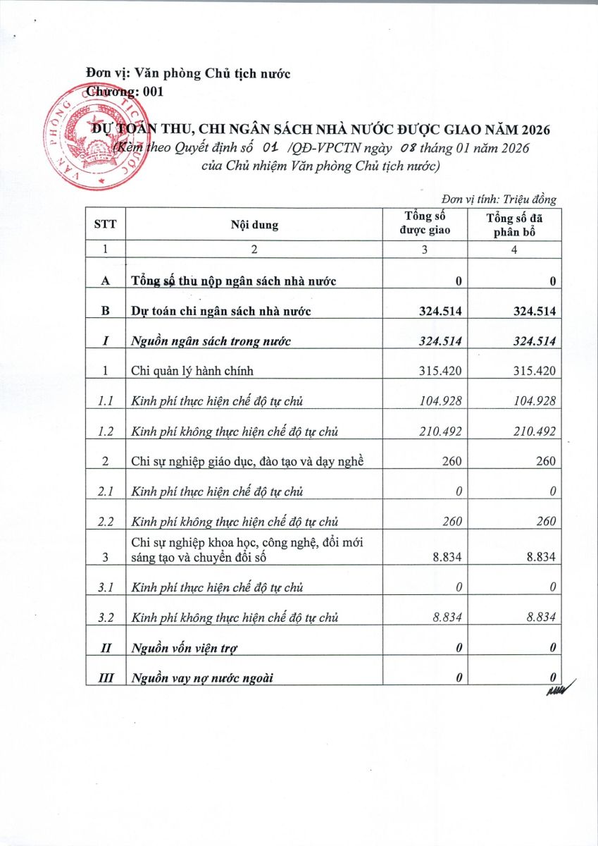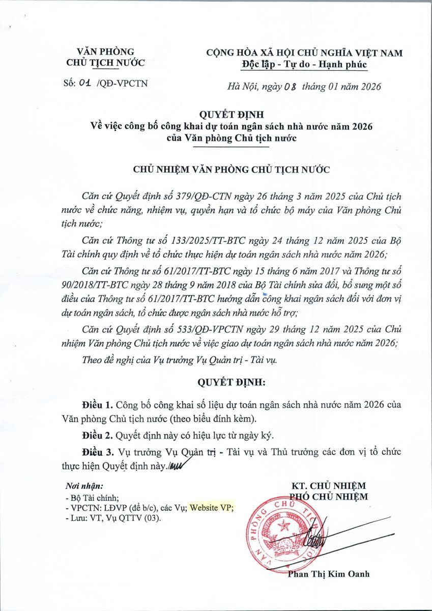 Ngày 3/1/2026, Văn phòng Chủ tịch nước đã ban hành Quyết định số 01/QĐ-VPCTN Về việc công bố công khai dự toán ngân sách nhà nước năm 2026. Sau đây là nội dung chi tiết của Quyết định: