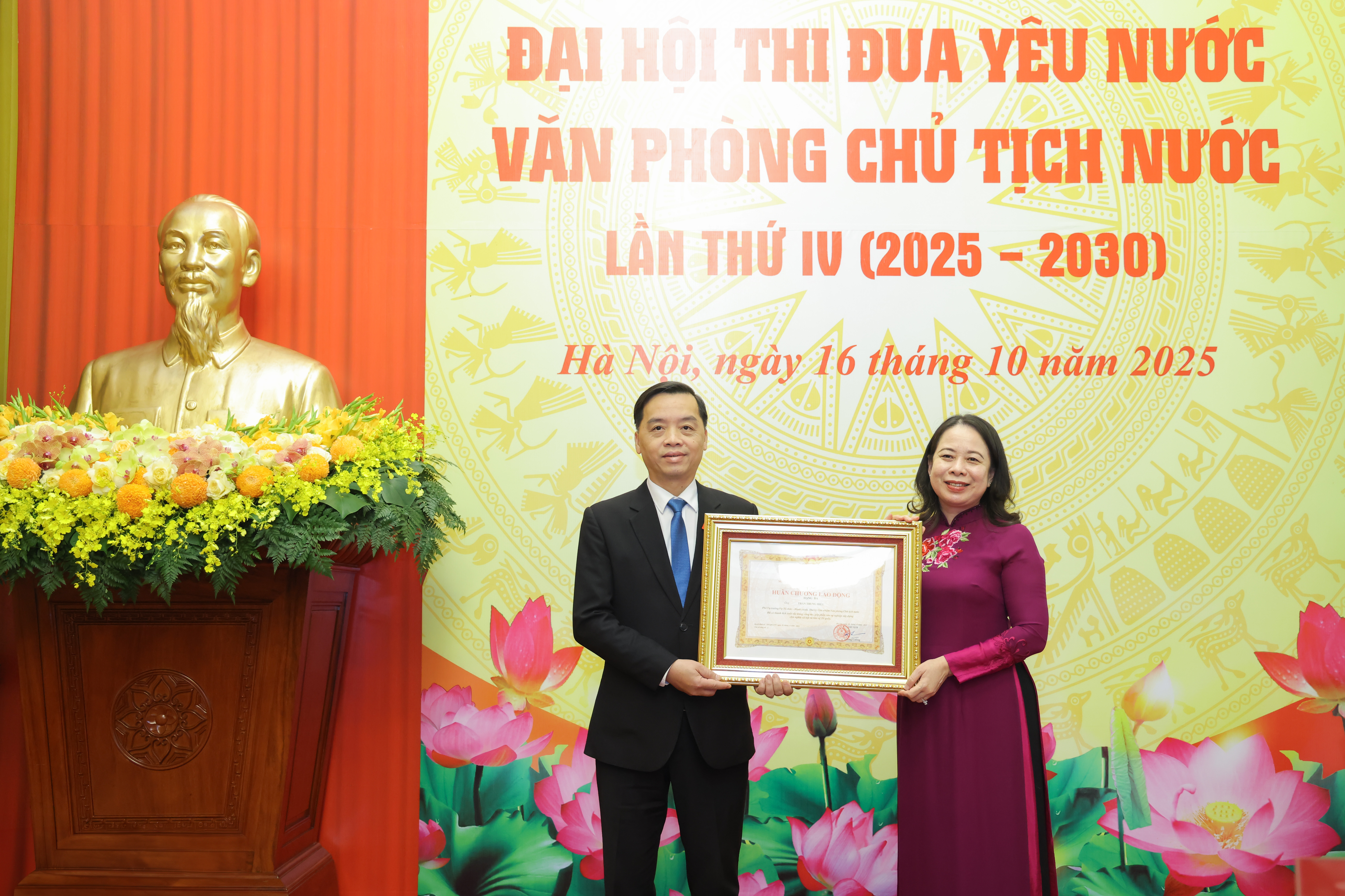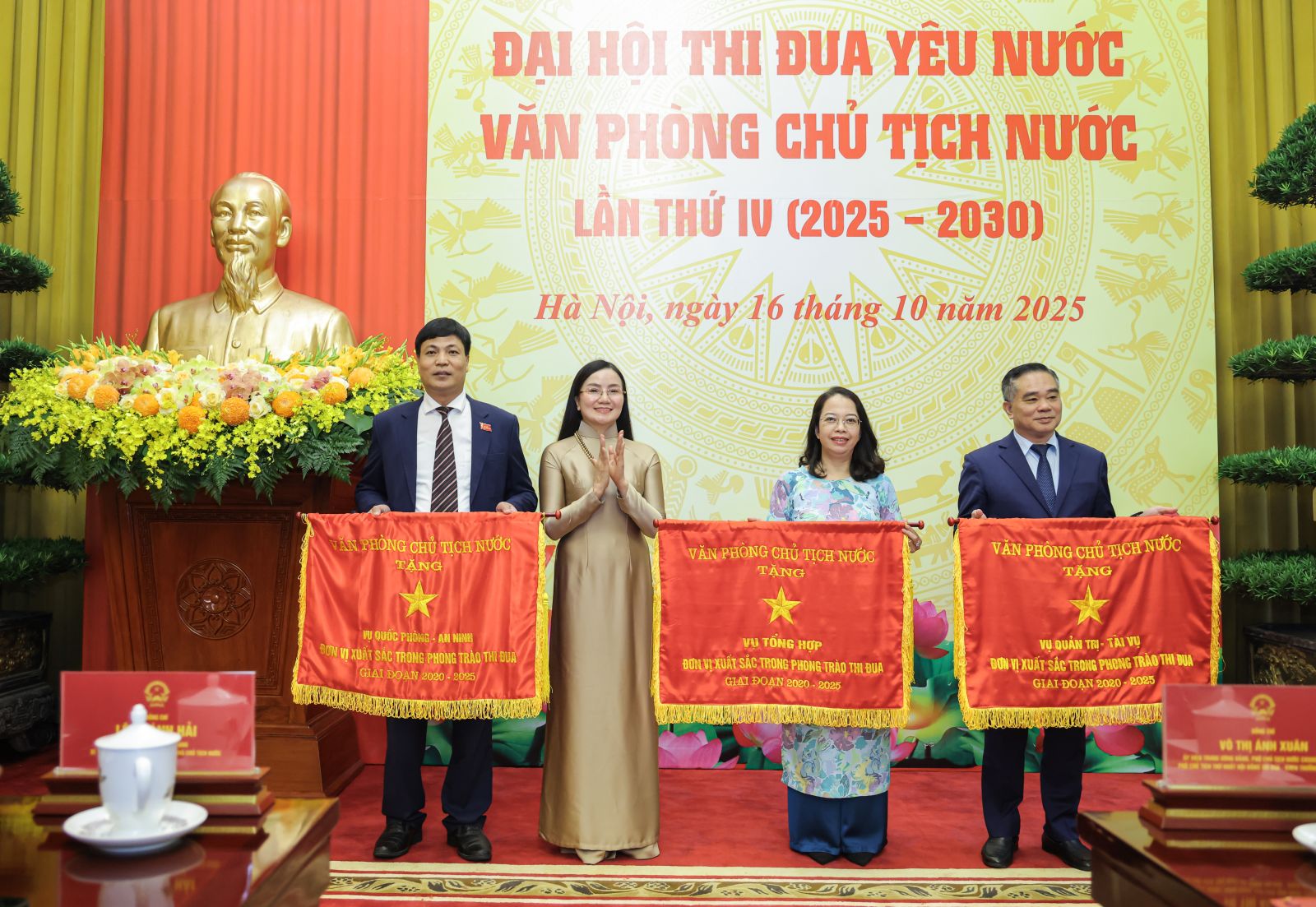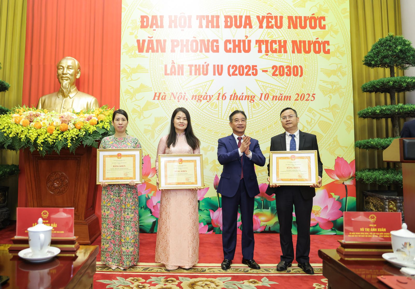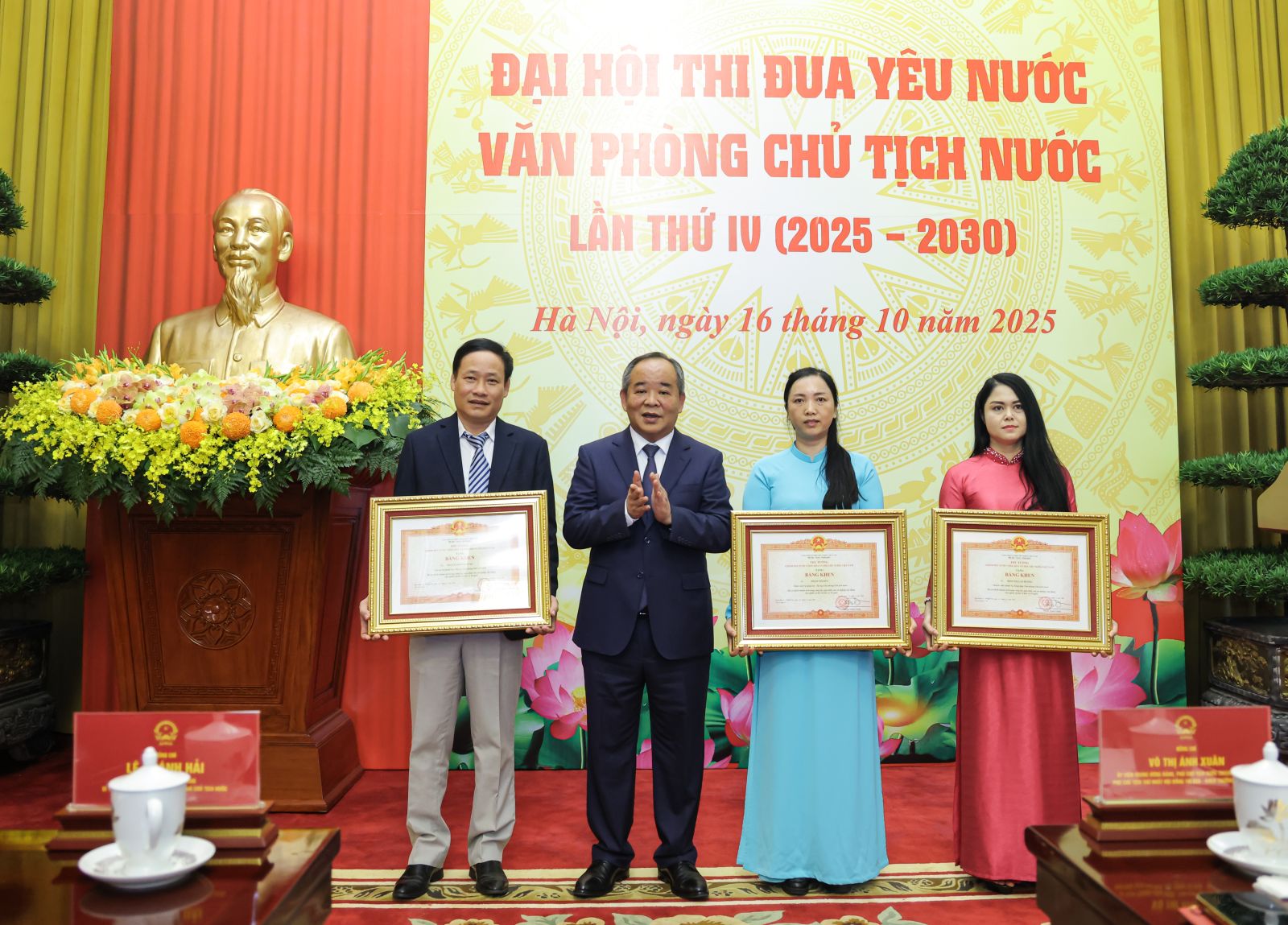 Trước đó, báo cáo tóm tắt phong trào thi đua yêu nước giai đoạn 2020-2025, Phó Chủ nhiệm Văn phòng Chủ tịch nước Phạm Thanh Hà cho biết, được sự quan tâm, chỉ đạo thường xuyên, trực tiếp của Chủ tịch nước, Phó Chủ tịch nước, công tác thi đua, khen thưởng của Văn phòng có nhiều nét đổi mới. Công tác khen thưởng được thực hiện chặt chẽ, đúng quy định, khen đúng người, đúng việc, đúng thành tích; khen thưởng đột xuất, khen thưởng người lao động trực tiếp luôn được quan tâm. Việc biểu dương, tôn vinh, nhân rộng điển hình, gương người tốt, việc tốt được triển khai kịp thời, thường xuyên, tạo sự lan tỏa tích cực.