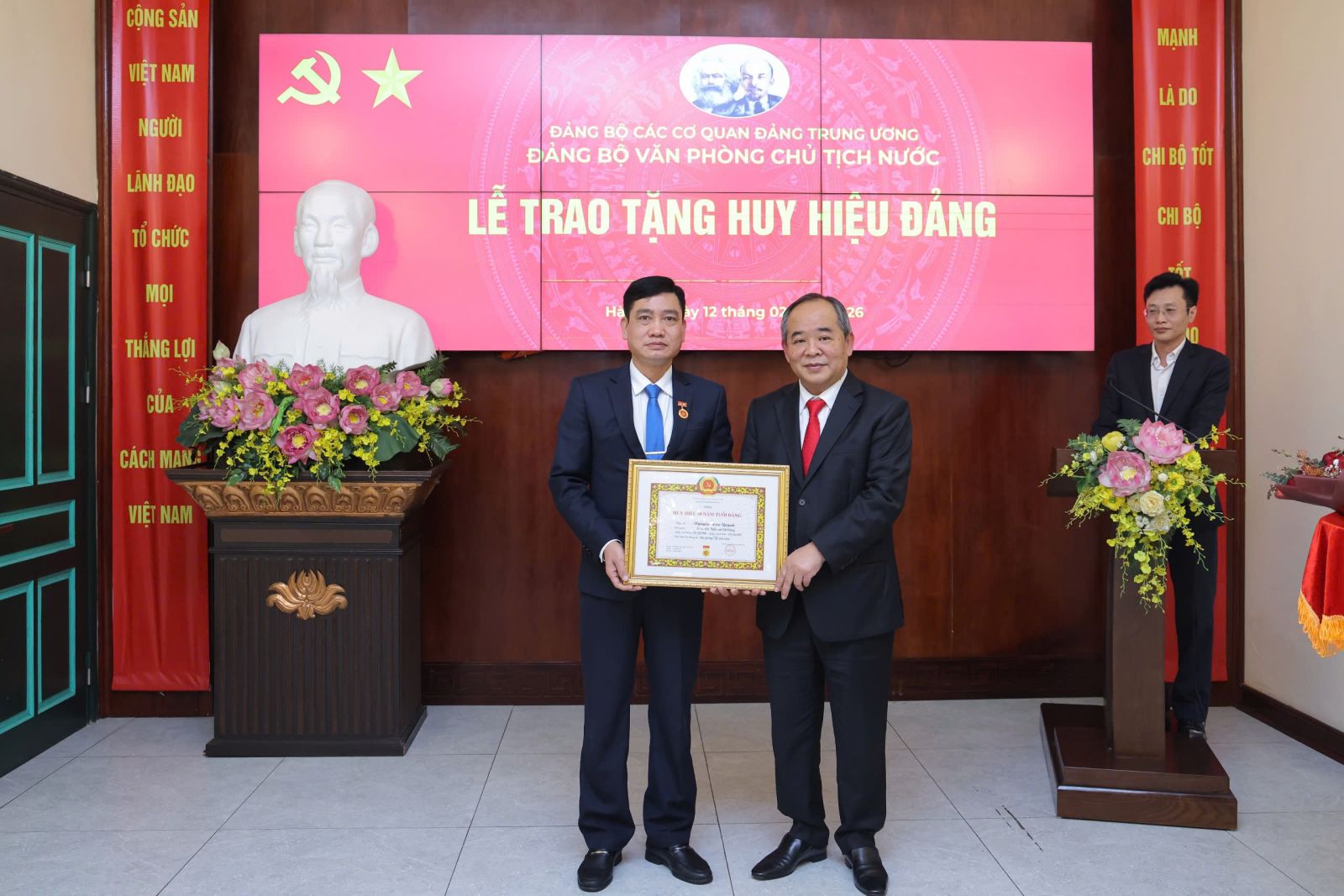 Bí thư Đảng uỷ, Chủ nhiệm Văn phòng Chủ tịch nước Lê Khánh Hải trao Huy hiệu 30 năm tuổi Đảng cho đồng chí Nguyễn Hữu Quỳnh. Ảnh: VPCTN