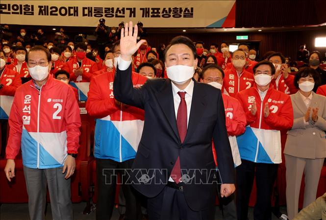 Tổng thống đắc cử Hàn Quốc Yoon Suk-yeol (phía trước) mừng chiến thắng cùng những người ủng hộ tại trụ sở đảng Sức mạnh nhân dân (PPP) ở Seoul, sau khi kết quả bầu cử Tổng thống được công bố, ngày 10/3/2022. Ảnh: THX/TTXVN