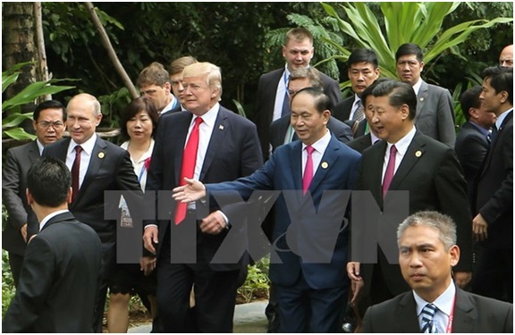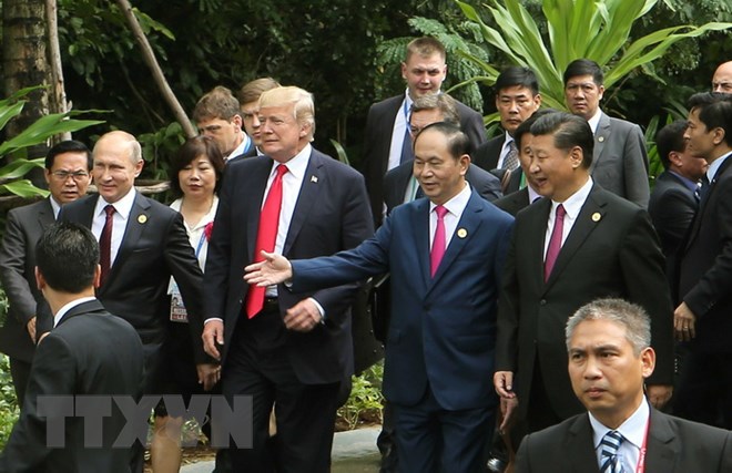 (Từ trái qua phải) Tổng thống Nga Vladimir Putin, Tổng thống Hoa Kỳ Donald Trump, Chủ tịch nước Trần Đại Quang, Chủ tịch Trung Quốc Tập Cận Bình trên đường tới địa điểm chụp ảnh chung, sau khi kết thúc Phiên họp kín thứ nhất của Hội nghị các Nhà lãnh đạo Kinh tế APEC lần thứ 25, sáng 11/11. (Ảnh: TTXVN)