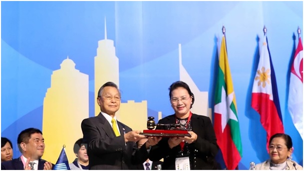 Thay mặt Quốc hội Việt Nam, Chủ tịch Quốc hội Nguyễn Thị Kim Ngân bày tỏ vinh dự tiếp nhận trọng trách Chủ tịch AIPA nhiệm kỳ 2019-2020 từ Chủ tịch Hạ viện Vương quốc Thái Lan Chuan Leekpai.