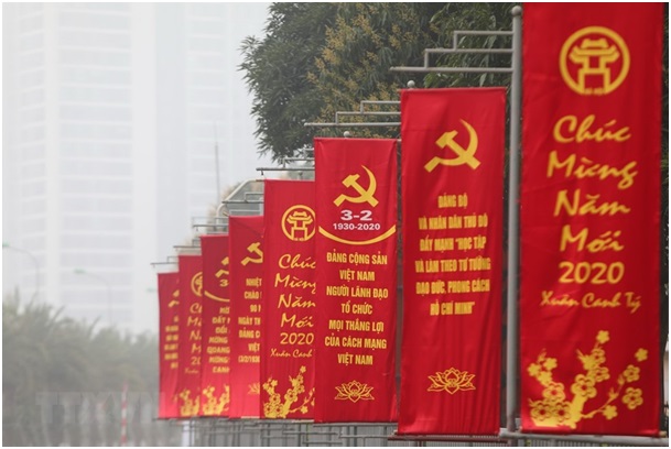 Khẩu hiệu được trang trí tại Trung tâm Hội nghị Quốc gia chào mừng kỷ niệm 90 năm Ngày thành lập Đảng Cộng sản Việt Nam. (Ảnh: Thành Đạt/TTXVN)
