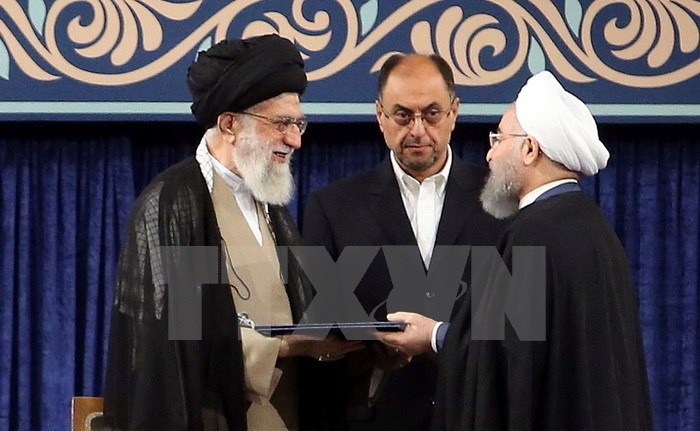 Tổng thống Iran Hassan Rouhani (phải), Đại giáo chủ Ali Khamenei (trái) tại buổi lễ nhậm chức ở Tehran ngày 3/8. (Nguồn: EPA/TTXVN)
