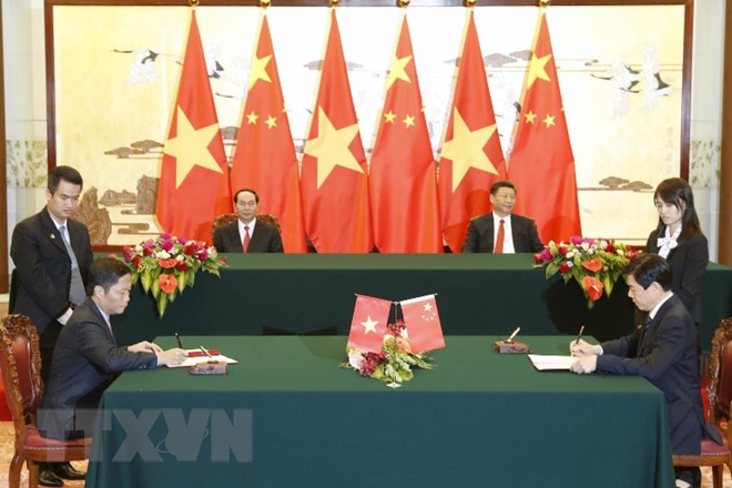 Tổng Bí thư, Chủ tịch nước Trung Quốc Tập Cận Bình và Chủ tịch nước Trần Đại Quang chứng kiến lễ ký kết Bản ghi nhớ về hợp tác thương mại điện tử giữa Bộ Công Thương nước Cộng hòa xã hội chủ nghĩa Việt Nam và Bộ Thương mại nước Cộng hòa nhân dân Trung Hoa. (Ảnh: Nhan Sáng/TTXVN)