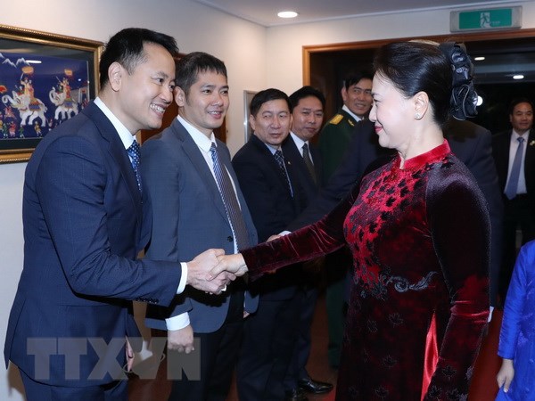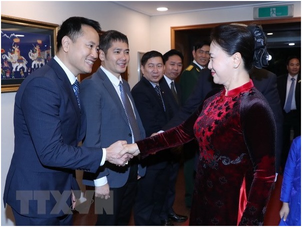 Ngay sau khi tới Seoul, Chủ tịch Quốc hội Nguyễn Thị Kim Ngân cùng Đoàn đại biểu cấp cao Quốc hội Việt Nam đã tới thăm, gặp gỡ cán bộ, nhân viên Đại sứ quán Việt Nam; đại diện cộng đồng người Việt Nam đang sinh sống, học tập và làm việc tại Hàn Quốc. Nói chuyện tại đây, Chủ tịch Quốc hội Nguyễn Thị Kim Ngân thông báo với cán bộ, nhân viên Đại sứ quán Việt Nam và đại diện cộng đồng người Việt Nam đang sinh sống, học tập, làm việc tại Hàn Quốc về sự phát triển tốt đẹp trong quan hệ giữa Việt Nam và Hàn Quốc; về tình hình trong nước thời gian gần đây.
