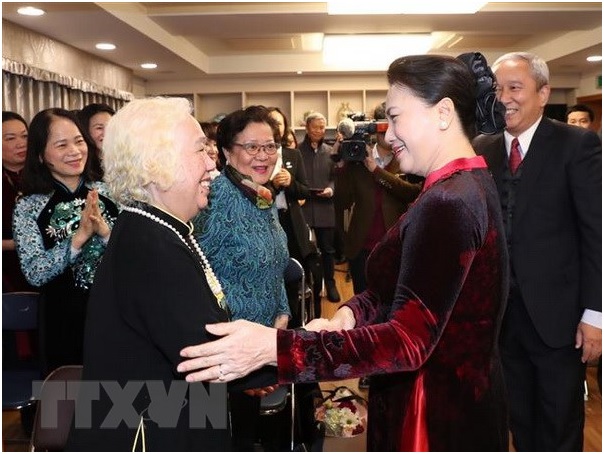 Chủ tịch Quốc hội Nguyễn Thị Kim Ngân gặp gỡ bà con kiều bào tại Hàn Quốc. (Ảnh: Trọng Đức/TTXVN)