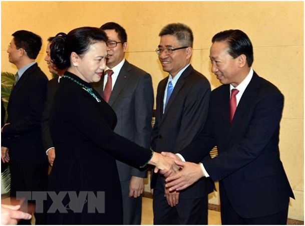 Sáng cùng ngày, Chủ tịch Quốc hội Nguyễn Thị Kim Ngân tiếp Chủ tịch Hội đồng quản trị tập đoàn viễn thông Trung Hưng (ZTE) Lý Tự Học và lãnh đạo tập đoàn công nghệ Datatang Trương Tử Tân.