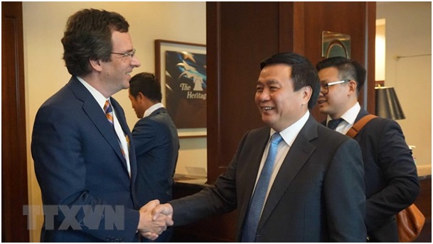 Bí thư Trung ương Đảng, Chủ tịch Hội đồng Lý luận trung ương, Giám đốc Học viện Chính trị quốc gia Hồ Chí Minh Nguyễn Xuân Thắng và ông Walter Lohman - Giám đốc Trung tâm nghiên cứu Heritage Foundation. (Ảnh: Đặng Thị Thu Huyền/TTXVN)