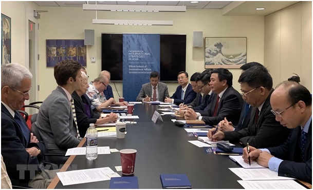 Ông chí Nguyễn Xuân Thắng, Bí thư Trung ương Đảng, Chủ tịch Hội đồng Lý luận trung ương, Giám đốc Học viện Chính trị quốc gia Hồ Chí Minh gặp và trao đổi với các chuyên gia nghiên cứu của Trường Quan hệ Quốc tế Elliott, Đại học George Washington. (Ảnh: Đặng Thị Thu Huyền/TTXVN)